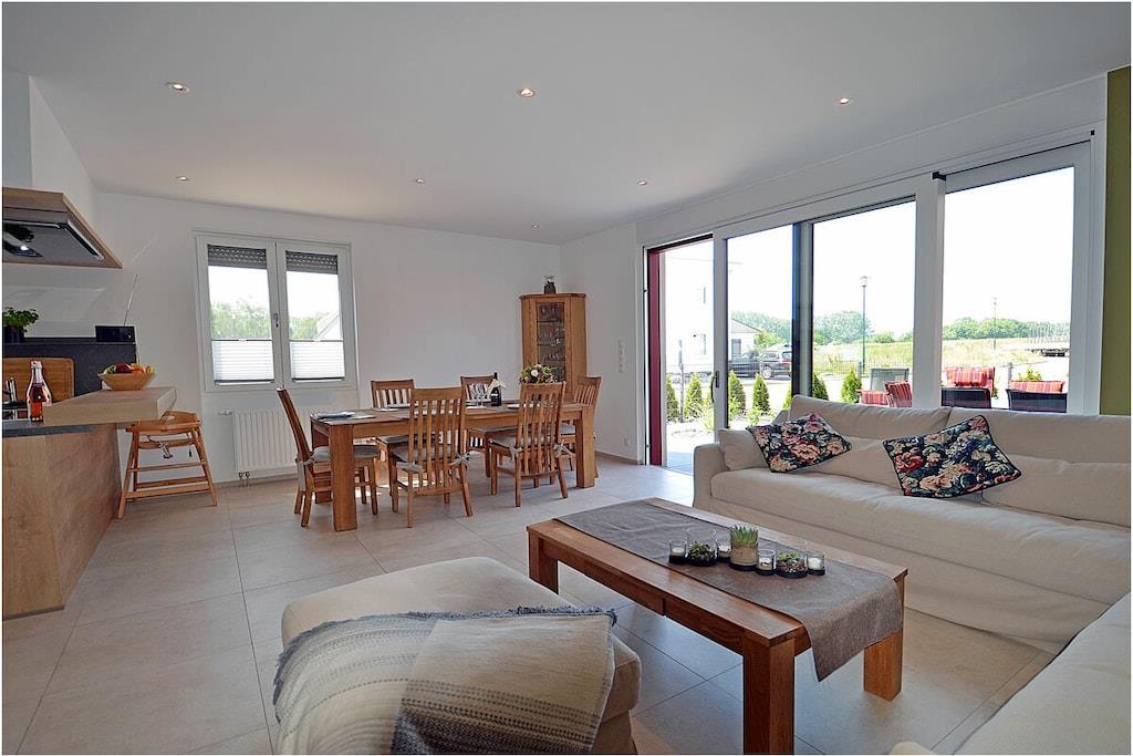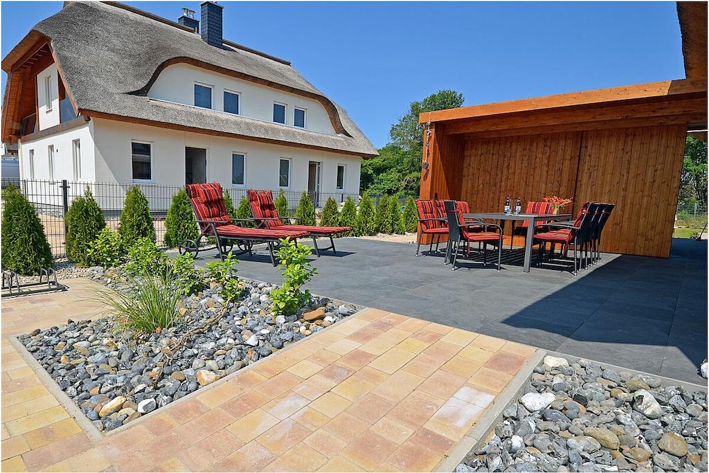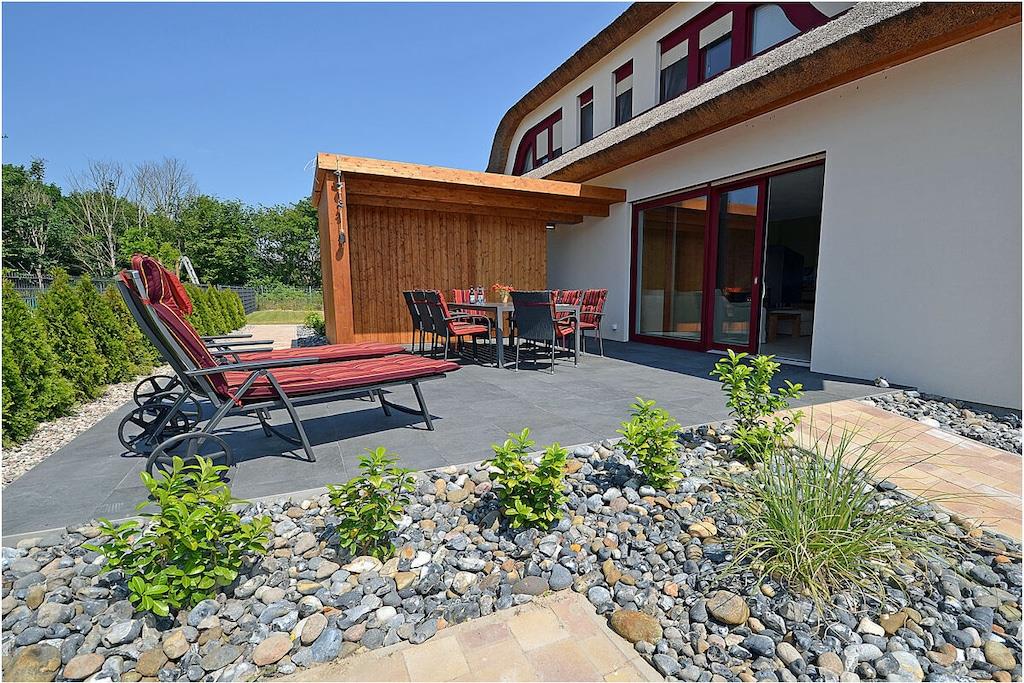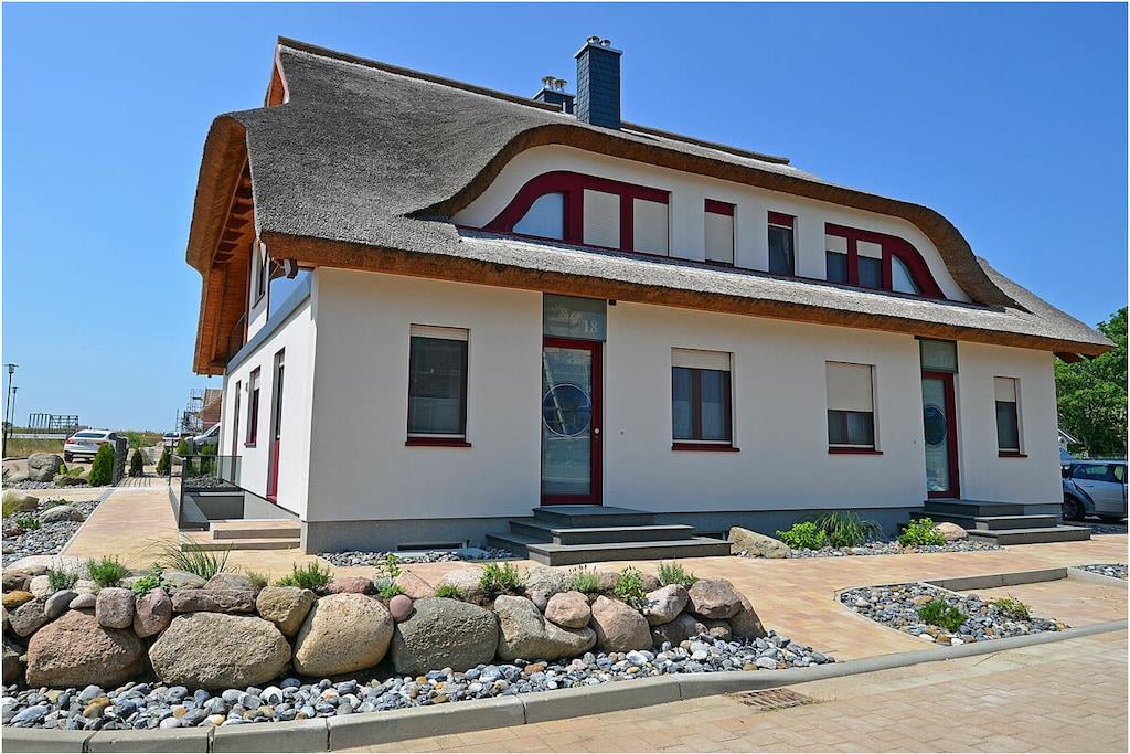 Erdgeschoss: modern und elegant eingerichteter Wohnbereich mit Kamin, gemütliche Couchlandschaft und Sessel, TV Sat/Kabel (Flatscreen), Radio, komplett ausgestattete hochwertige Einbauküche mit Kochinsel, großer Esstisch für 6 Personen, 4-Plattenherd (Induktionsherd), Backofen, zwei Kühlschränke mit je einem kleinem Gefrierfach, Geschirrspüler, Mikrowelle und diversen Elektrogeräten wie z.B. Kapselkaffeemaschine, 1. Schlafzimmer mit einem Einzelbett (120 x 200) mit Kleiderschrank und Schreibtisch, großes Bad mit ebenerdiger Dusche, Badewanne, WC, Föhn und Sauna Obergeschoss: 2. und 3. Schlafzimmer, jedes Schlafzimmer verfügt über einen Balkon und ein eigenes separates Bad mit Dusche und WC, beide Schlafzimmer ausgestattet mit Doppelbett (zwei getrennte Matratzen je 90 x 200), großer Spiegelkleiderschrank/ begehbarer Kleiderschrank mit viel Staumöglichkeiten und TV (Flatscreen) und kleinen Schreibtisch Souterrain: Waschmaschine, Bügelbrett und Bügeleisen, Wäscheständer Außenbereich: gepflegtes Grundstück, Terrasse mit Gartenmöbeln (6 Gartenstühle) mit bequemen Sitzauflagen, 2 Liegestühle und Grill vorhanden Zeit für Erholung-Genießen Sie traumhafte Urlaubstage Erstvermietung seit dem 01.07.2020 Das schöne neuerbaute Reetgedeckte Doppelhaus „Meeresrauschen“ ist modern und liebevoll eingerichtet. Das gepflegte Grundstück mit Liegewiese ist komplett umzäunt und lädt zum Entspannen ein. Internet (WLAN) steht Ihnen kostenfrei zur Verfügung. Für die Kleinen stehen 2 Kinderreisebetten und 1 Hochstuhl zur Verfügung. Fußbodenheizung ist im gesamten Haus. Die Fenster sind mit elektrischen Außenjalousien und teilweise mit Insektenschutz ausgestattet. Das Ferienhaus „Meeresrauschen“ ist ein Nichtraucherquartier. Am Objekt befinden sich 2 PKW-Stellplätze und Abstellmöglichkeiten für Fahrräder. Haustiere sind nicht erwünscht.
