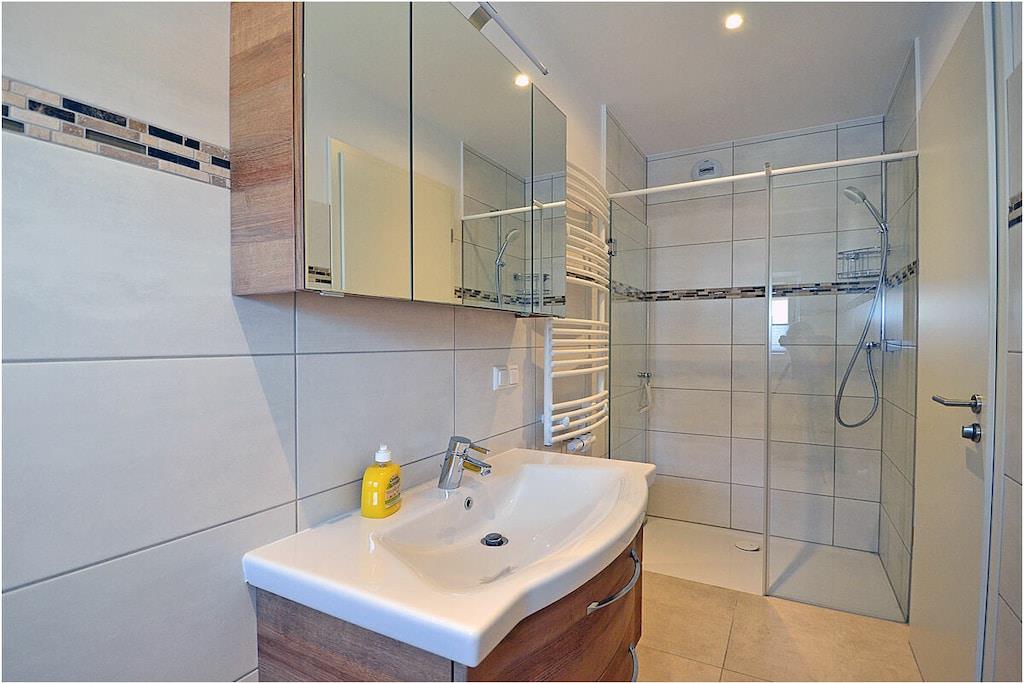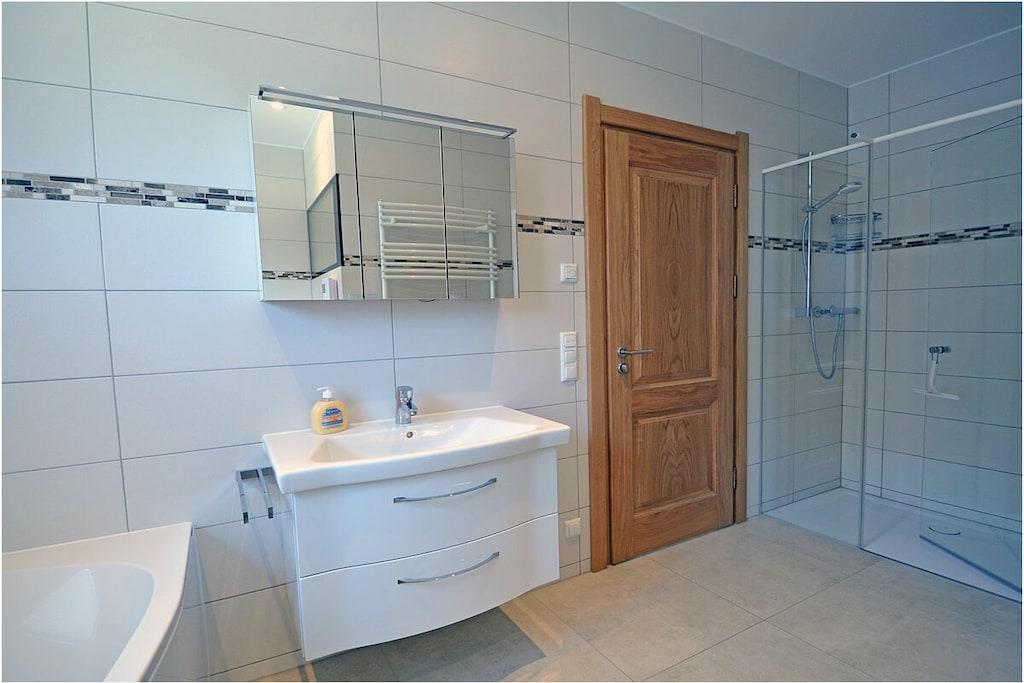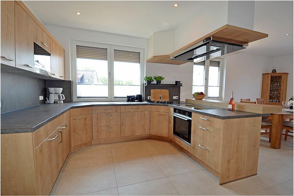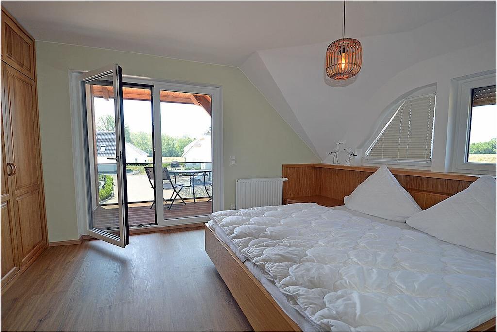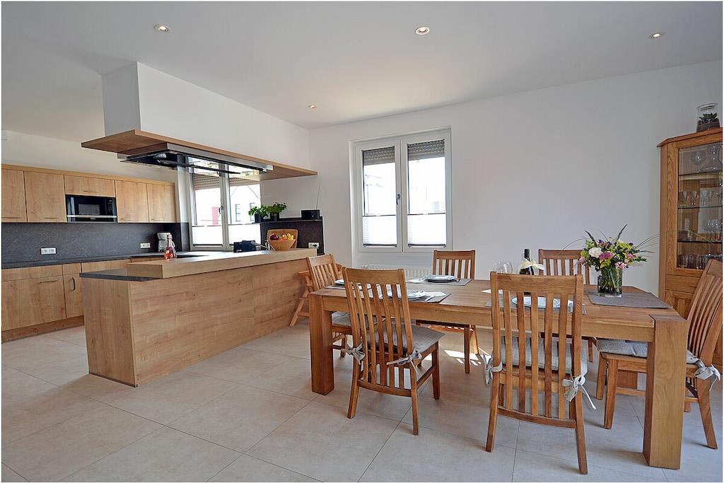 Erdgeschoss: modern und elegant eingerichteter Wohnbereich mit Kamin, gemütliche Couchlandschaft und Sessel, TV Sat/Kabel (Flatscreen), Radio, komplett ausgestattete hochwertige Einbauküche mit Kochinsel, großer Esstisch für 6 Personen, 4-Plattenherd (Induktionsherd), Backofen, zwei Kühlschränke mit je einem kleinem Gefrierfach, Geschirrspüler, Mikrowelle und diversen Elektrogeräten wie z.B. Kapselkaffeemaschine, 1. Schlafzimmer mit einem Einzelbett (120 x 200) mit Kleiderschrank und Schreibtisch, großes Bad mit ebenerdiger Dusche, Badewanne, WC, Föhn und Sauna Obergeschoss: 2. und 3. Schlafzimmer, jedes Schlafzimmer verfügt über einen Balkon und ein eigenes separates Bad mit Dusche und WC, beide Schlafzimmer ausgestattet mit Doppelbett (zwei getrennte Matratzen je 90 x 200), großer Spiegelkleiderschrank/ begehbarer Kleiderschrank mit viel Staumöglichkeiten und TV (Flatscreen) und kleinen Schreibtisch Souterrain: Waschmaschine, Bügelbrett und Bügeleisen, Wäscheständer Außenbereich: gepflegtes Grundstück, Terrasse mit Gartenmöbeln (6 Gartenstühle) mit bequemen Sitzauflagen, 2 Liegestühle und Grill vorhanden Zeit für Erholung-Genießen Sie traumhafte Urlaubstage Erstvermietung seit dem 01.07.2020 Das schöne neuerbaute Reetgedeckte Doppelhaus „Meeresrauschen“ ist modern und liebevoll eingerichtet. Das gepflegte Grundstück mit Liegewiese ist komplett umzäunt und lädt zum Entspannen ein. Internet (WLAN) steht Ihnen kostenfrei zur Verfügung. Für die Kleinen stehen 2 Kinderreisebetten und 1 Hochstuhl zur Verfügung. Fußbodenheizung ist im gesamten Haus. Die Fenster sind mit elektrischen Außenjalousien und teilweise mit Insektenschutz ausgestattet. Das Ferienhaus „Meeresrauschen“ ist ein Nichtraucherquartier. Am Objekt befinden sich 2 PKW-Stellplätze und Abstellmöglichkeiten für Fahrräder. Haustiere sind nicht erwünscht.