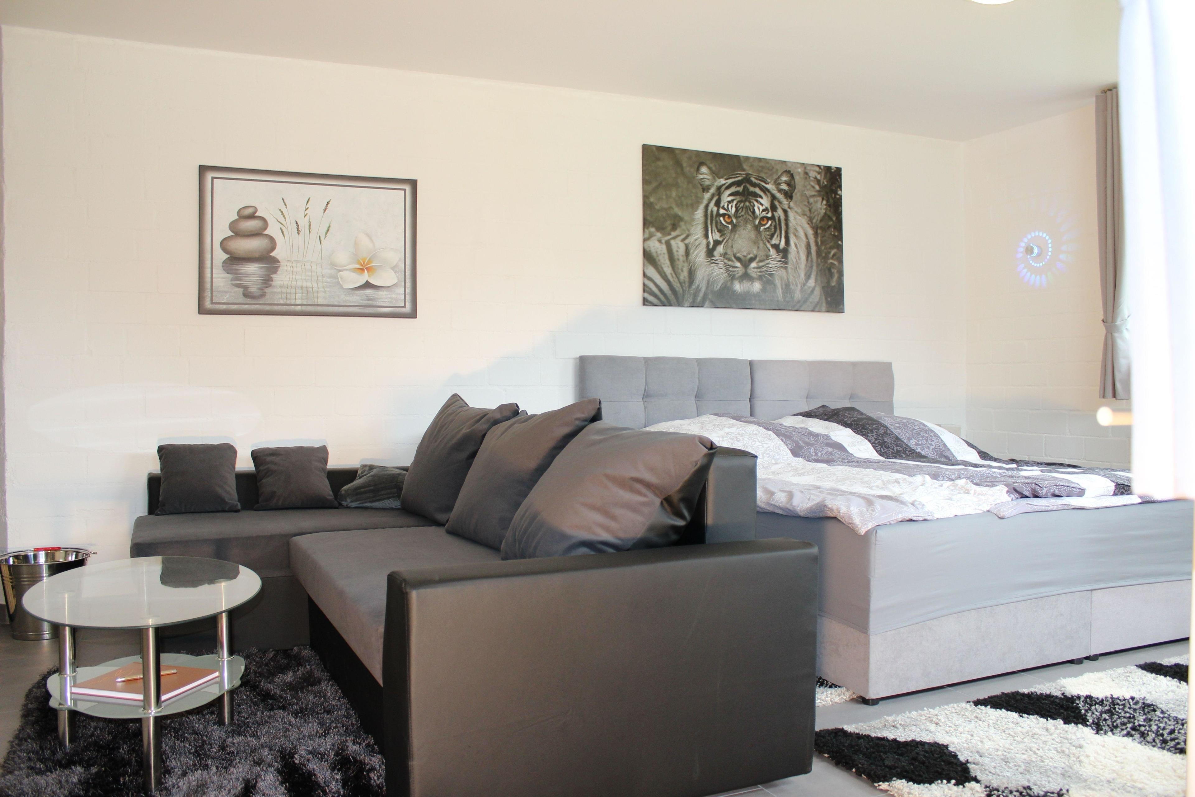 Ein Zimmer mit Doppelbett, Küchenzeile und Sofa.