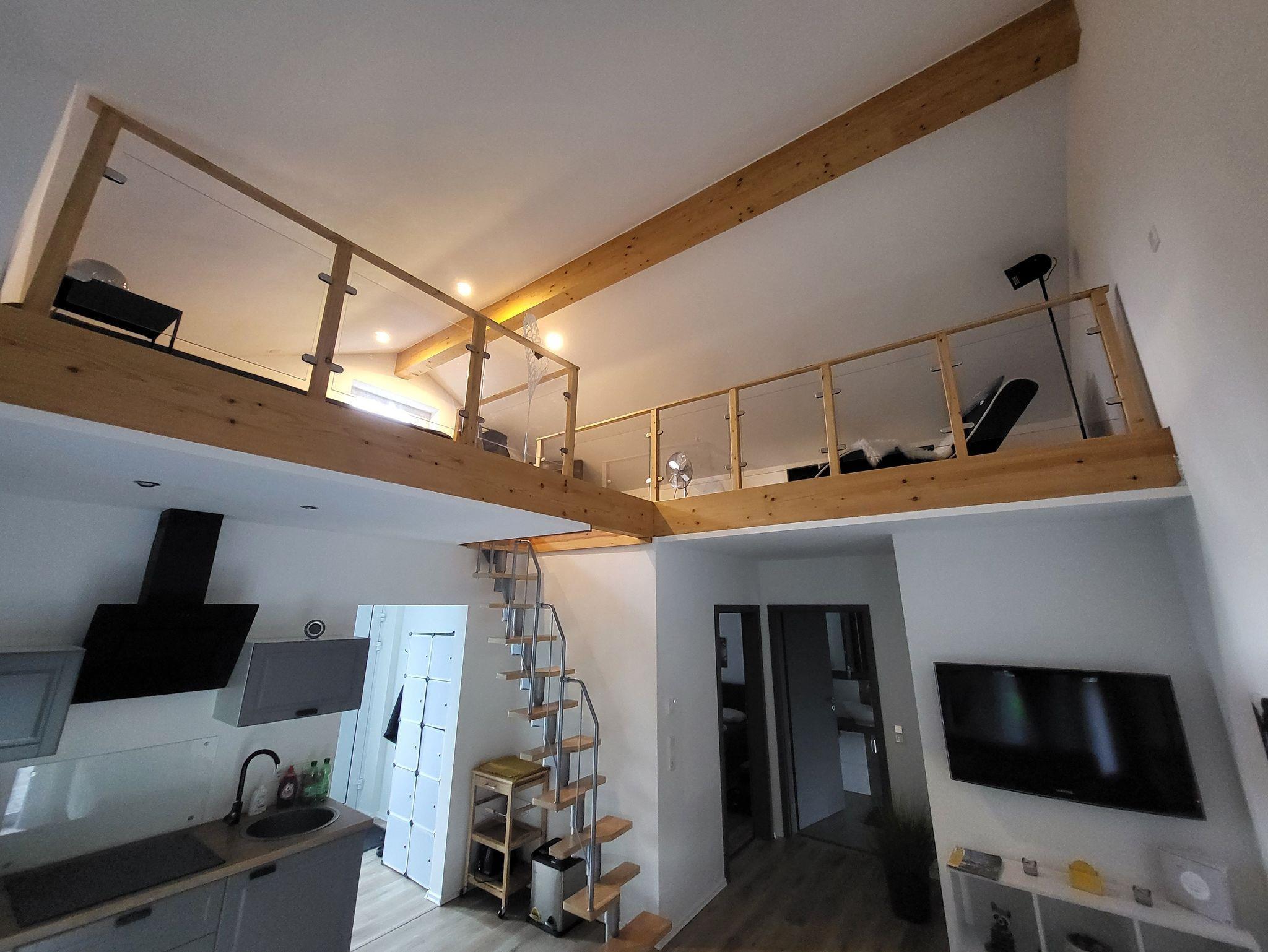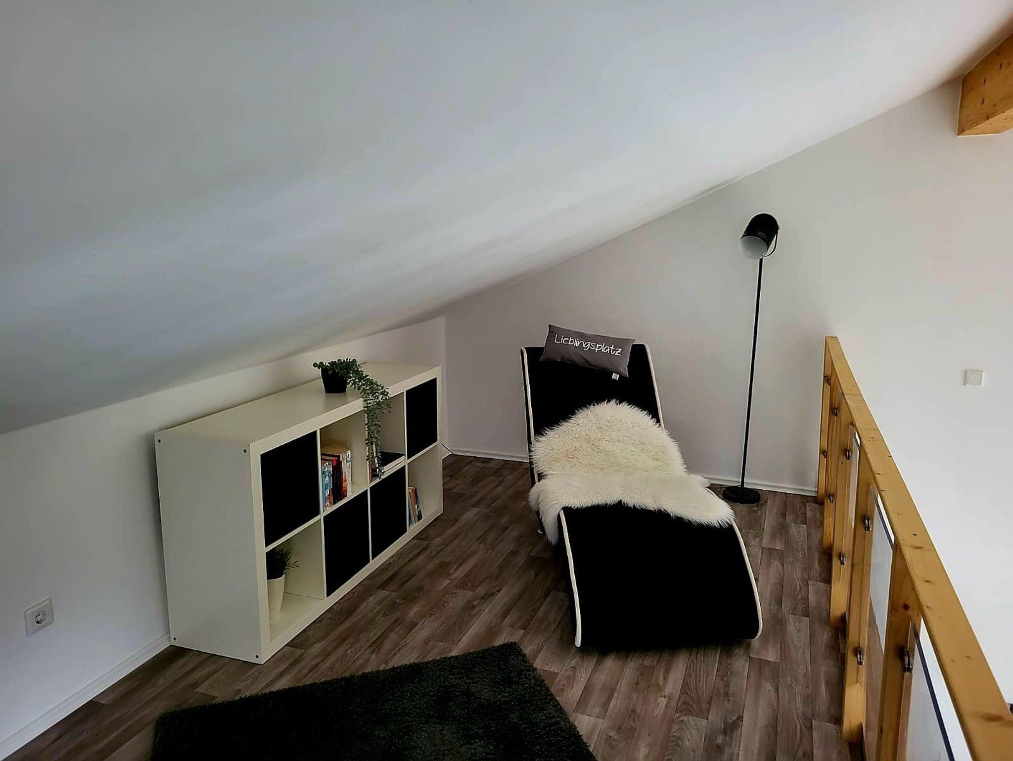 - 1x Schlafboden (steile Treppe) mit Doppelbett 180x200, Flachbildfernseher, Regal mit Schubfächern, Relaxliege
