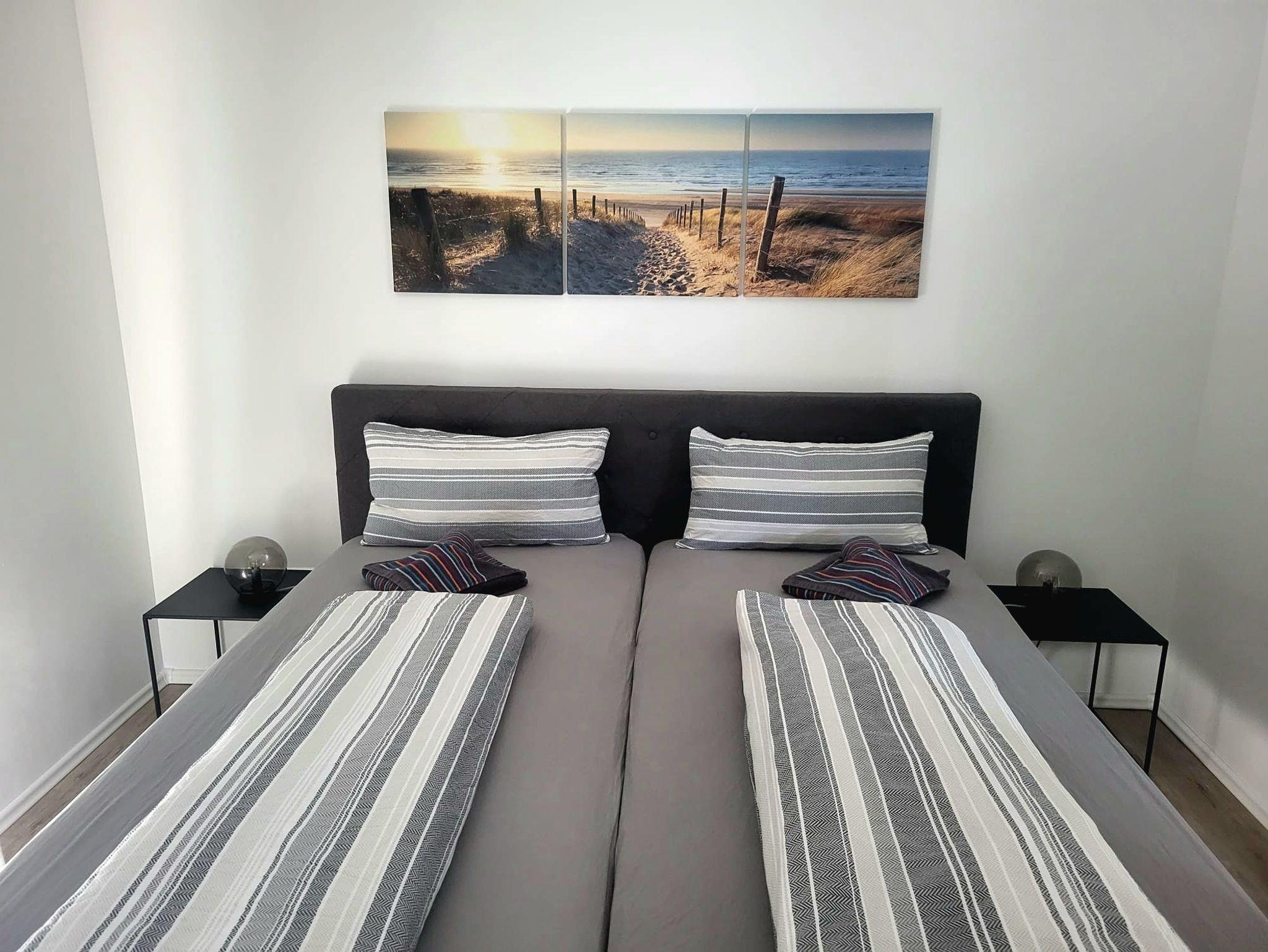 - 1x Schlafzimmer unten mit Doppelbett 180x200, Flachbildfernseher, eine Kommode und zwei Kleiderständern