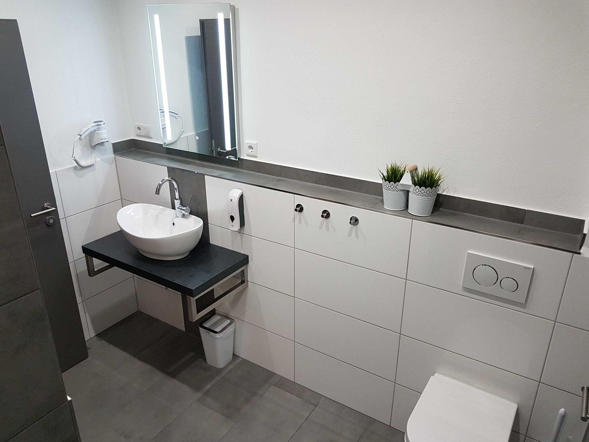 - Badezimmer mit Dusche, WC und Haartrockner