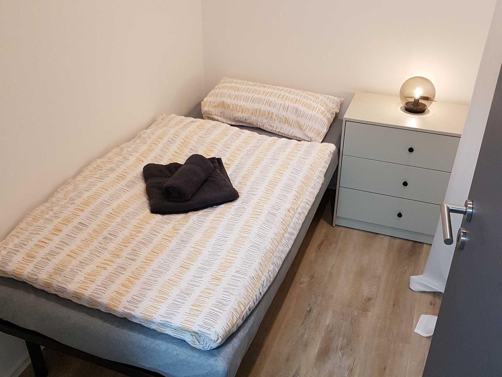 - 1x Einzelzimmer unten mit einem Bett 190x90, Flachbildfernseher und eine Kommode