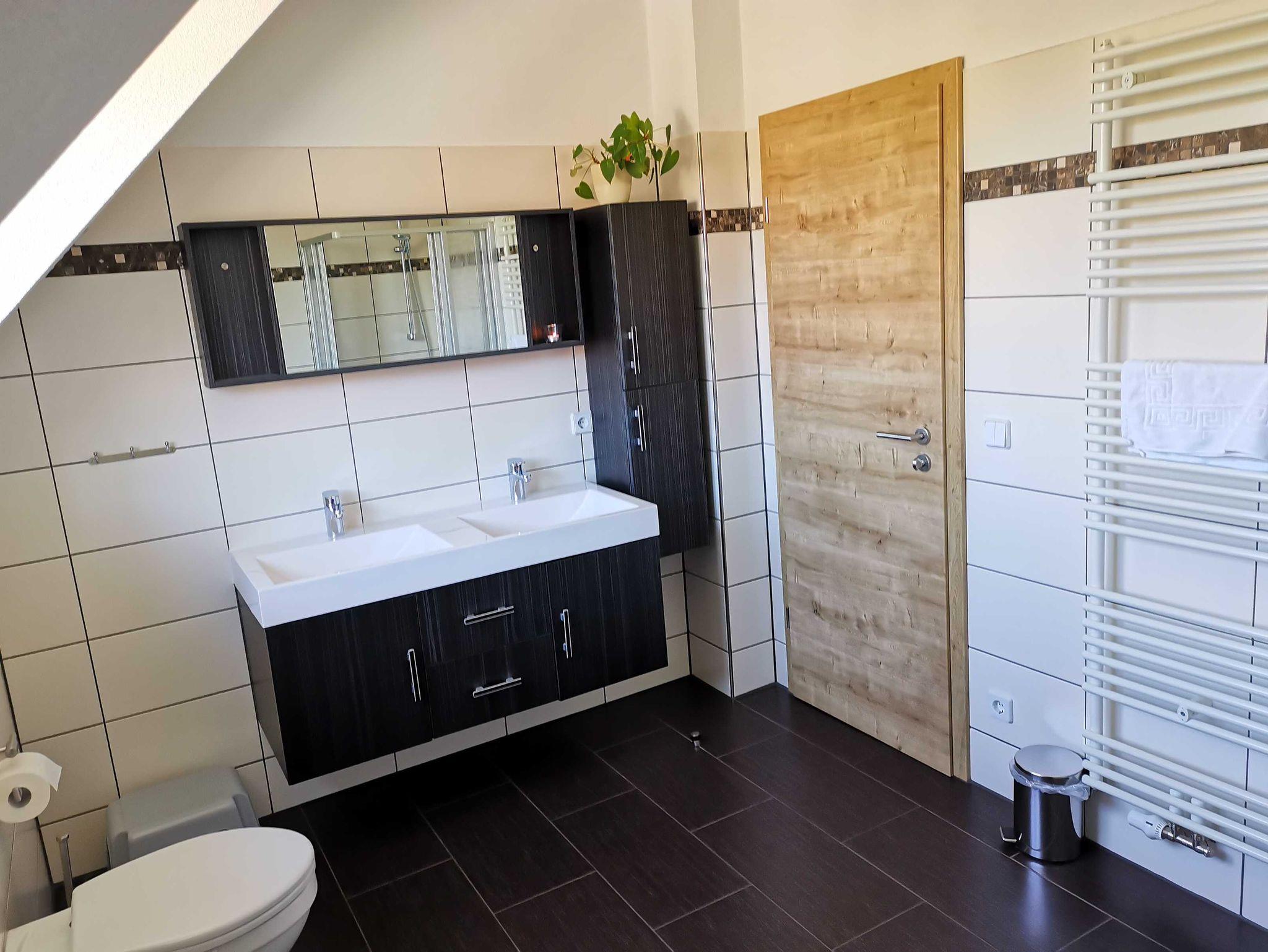 1 Bad mit Wanne, Dusche, doppeltem Waschbecken, WC