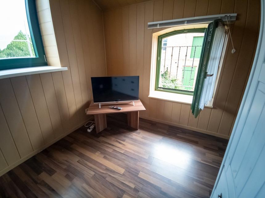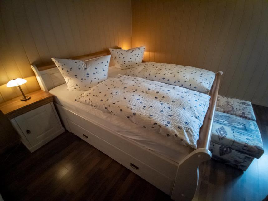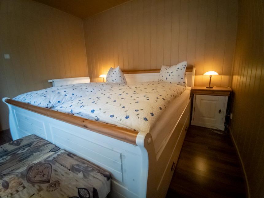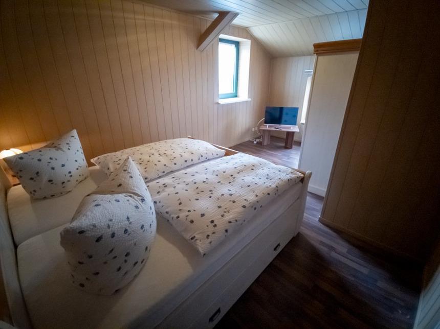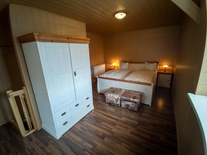 Die Treppe im Erdgeschoss führt ins Schlafzimmer, dieses ist Ausgestattet mit einem großen Kleiderschrank, einem 190x200 cm großem Doppelbett, 2 Hockern und einem Fernsehgerät.