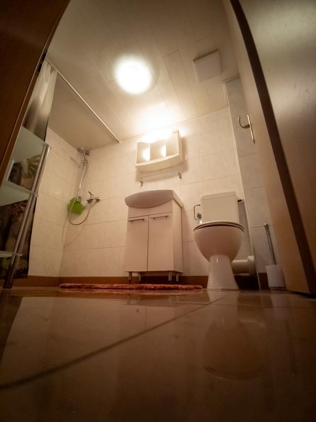Von der Wohnküche aus betreten Sie das Badezimmer mit einer Dusche, dem WC und einem Waschbecken.