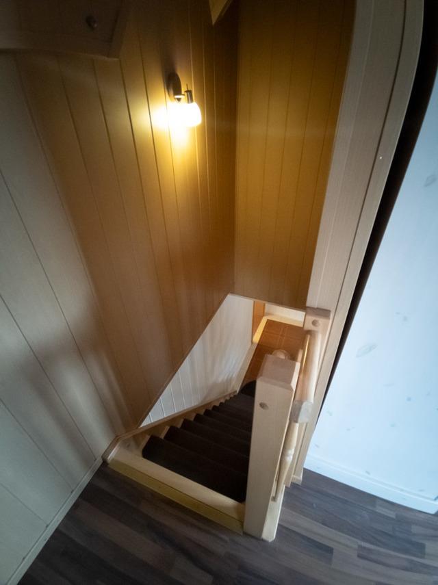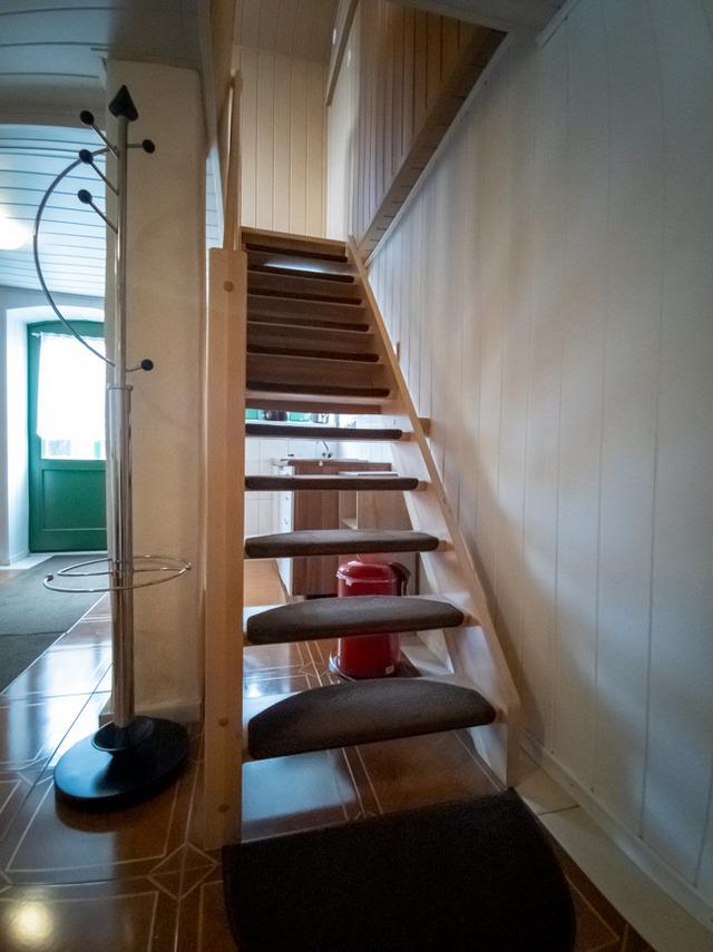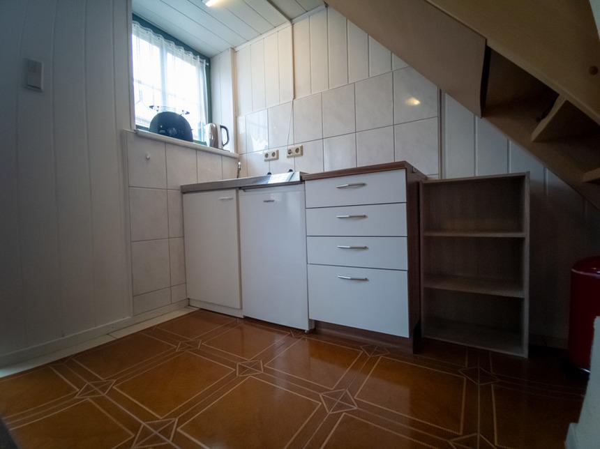 Sie betreten die Wohnung ebenerdig in die Wohnküche. Hier befindet sich ein Esstisch mit Stühlen und einer Sitzecke. Die Treppe führt ins Schlafzimmer. Die Küchenzeile ist mit 2 Kochplatten, einem Spülbecken, einem Kühlschrank mit Gefrierfach, einer Kaffeemaschine, einem Toaster und einem Wasserkocher ausgestattet.
