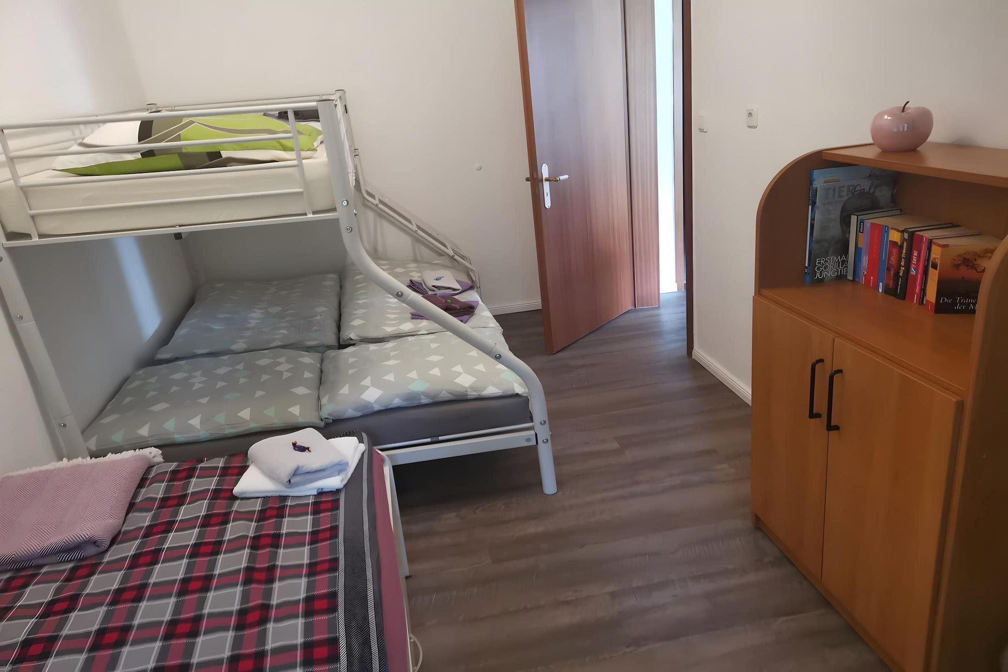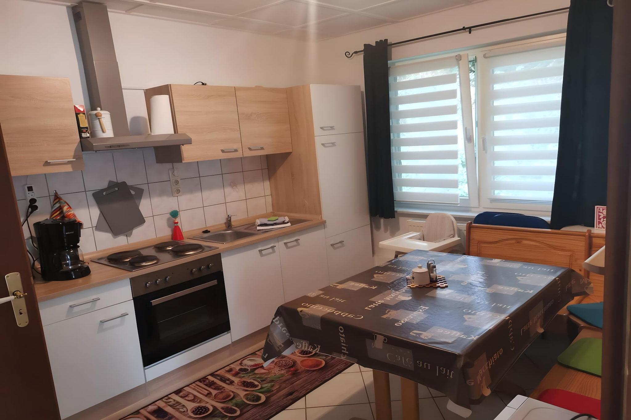 Kun 50 meter fra Goldbergs glitrende sø og badestrand er dette rummelige opholdssted i stueetagen en drøm for familier eller grupper, der søger udendørs eventyr og afslappet ophold. Indenfor gør et stort køkken med spisebord og alle faciliteter (kaffemaskine, ovn, mikroovn) hjemmelavede måltider til en leg. Den hyggelige stue/soveværelse byder på en dobbeltseng og sovesofa, satellit-tv og en ekstra spiseplads. Sovearrangementer er alsidige: en 3-personers køjeseng (70 × 160 cm) til små eventyrere, plus et separat soveværelse med dobbeltseng til voksne. Badeværelset er udstyret med brusekabine, hårtørrer og alt det nødvendige, mens en børneseng tilføjer ekstra bekvemmelighed for unge gæster. Med terrasse, have, grill og vaskemaskine mod betaling, vil du være udstyret til længere ophold. Prøv fiskeri eller vandsport kun få skridt væk (100 m), køb dagligvarer på Aldi eller REWE, eller nyd en spisning ved søen inden for 50 m. Nærliggende attraktioner såsom Dobbertiner-søen (1 km) og lokale caféer (1 km) afrunder en godt forbundet, men alligevel rolig flugt.