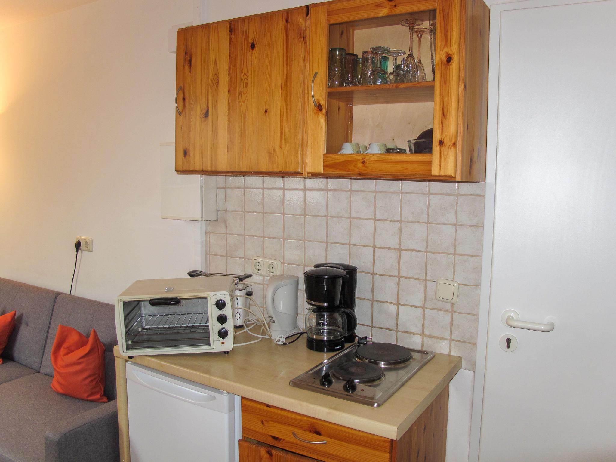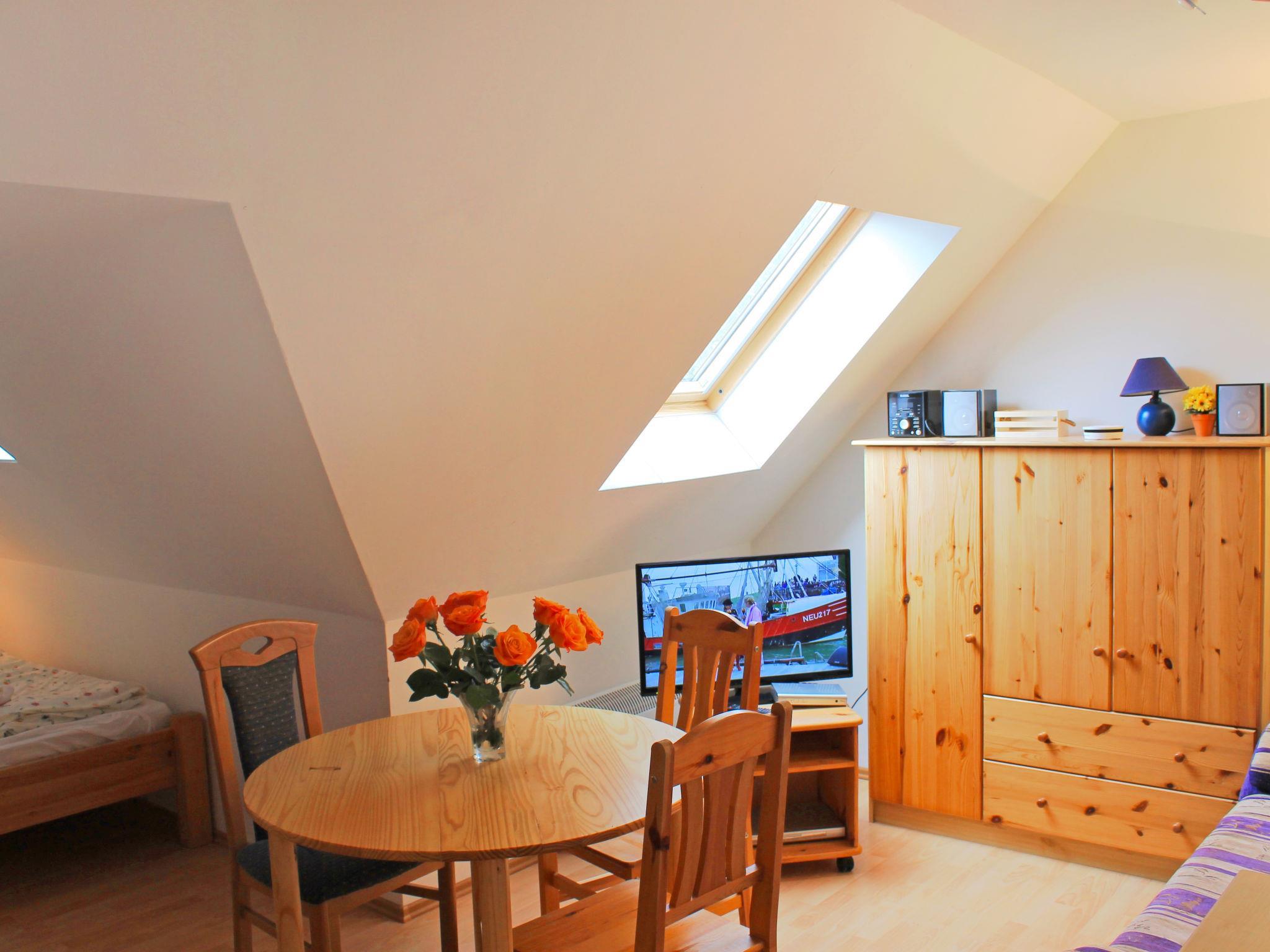 1-room apartment 20 m2 on 2nd floor. Living/sleeping room with sloping ceilings with 2 beds (90 cm, length 200 cm), satellite TV (flat screen), DVD. Kitchenette (2 hot plates, electric coffee machine). Shower/WC. Electric heating. Facilities: Internet (WiFi, free). Please note: non-smokers only. Smoke alarm. Kitchenette without own water supply.