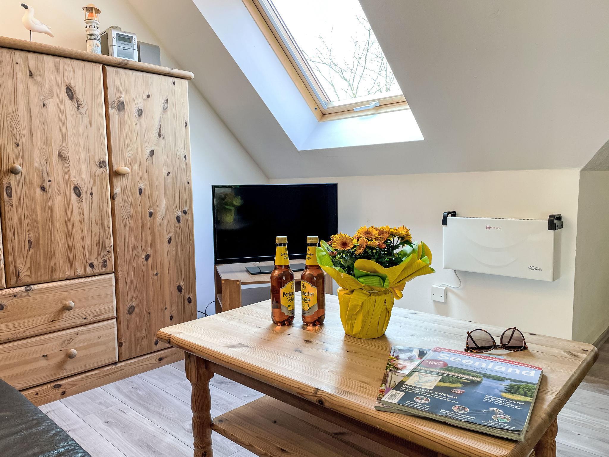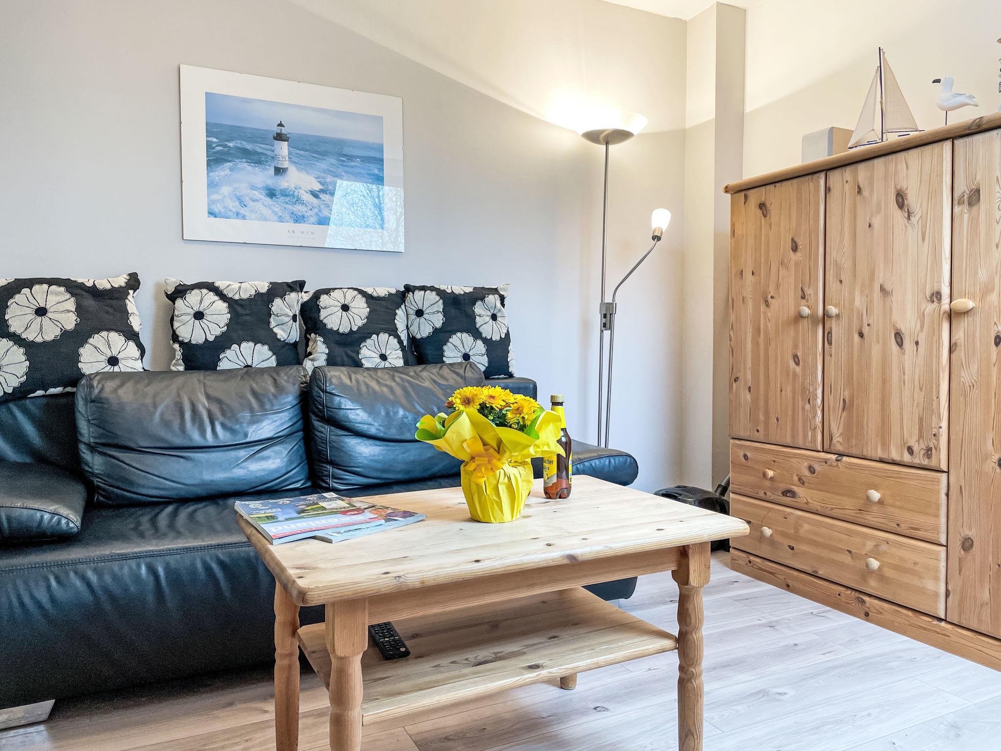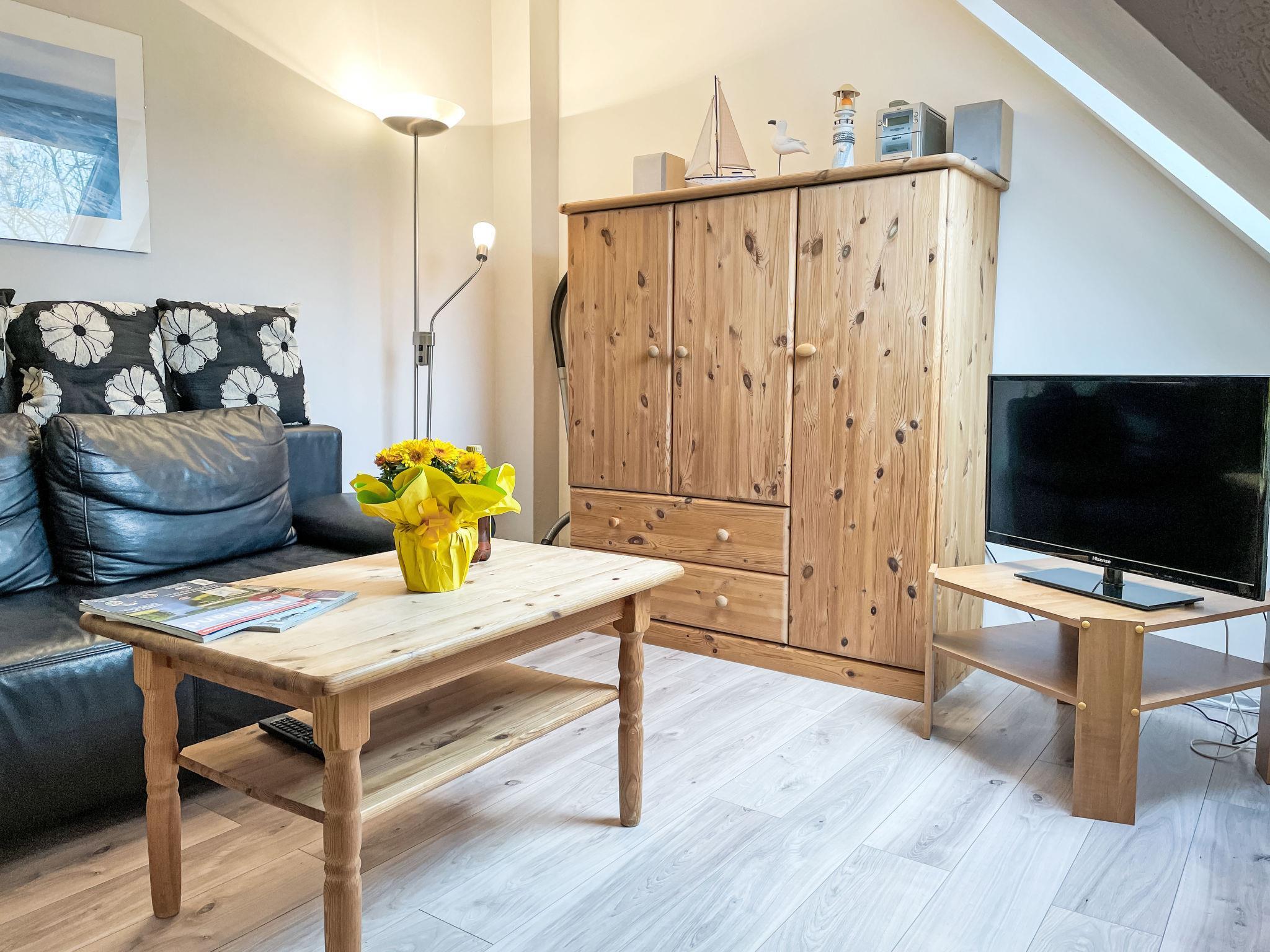 1-room apartment 24 m2 on 2nd floor. Living/sleeping room with sloping ceilings with 1 double bed (180 cm, length 200 cm), satellite TV (flat screen), DVD. Kitchenette (2 hot plates, electric coffee machine). Shower/WC. Electric heating. Facilities: Internet (WiFi, free). Please note: non-smokers only. Smoke alarm.