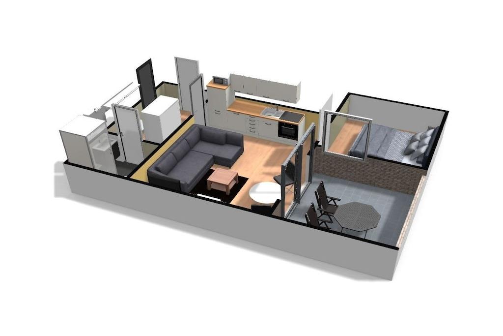 Stueetage: (Stue(enkeltsovesofa, Fjernsyn, spisebord, pejs, kakkelovn, radio, CD-afspiller, kogeplade, elkedel, brødrister, kaffemaskine, ovn, mikrobølgeovn, opvaskemaskine , køleskab, fryser, føntørrer, Håndklæder inkl.), soveværelse(dobbeltseng), badeværelse(bruser, håndvask, toilet, Håndklæder inkl.)) grill, balkon, havemøbler