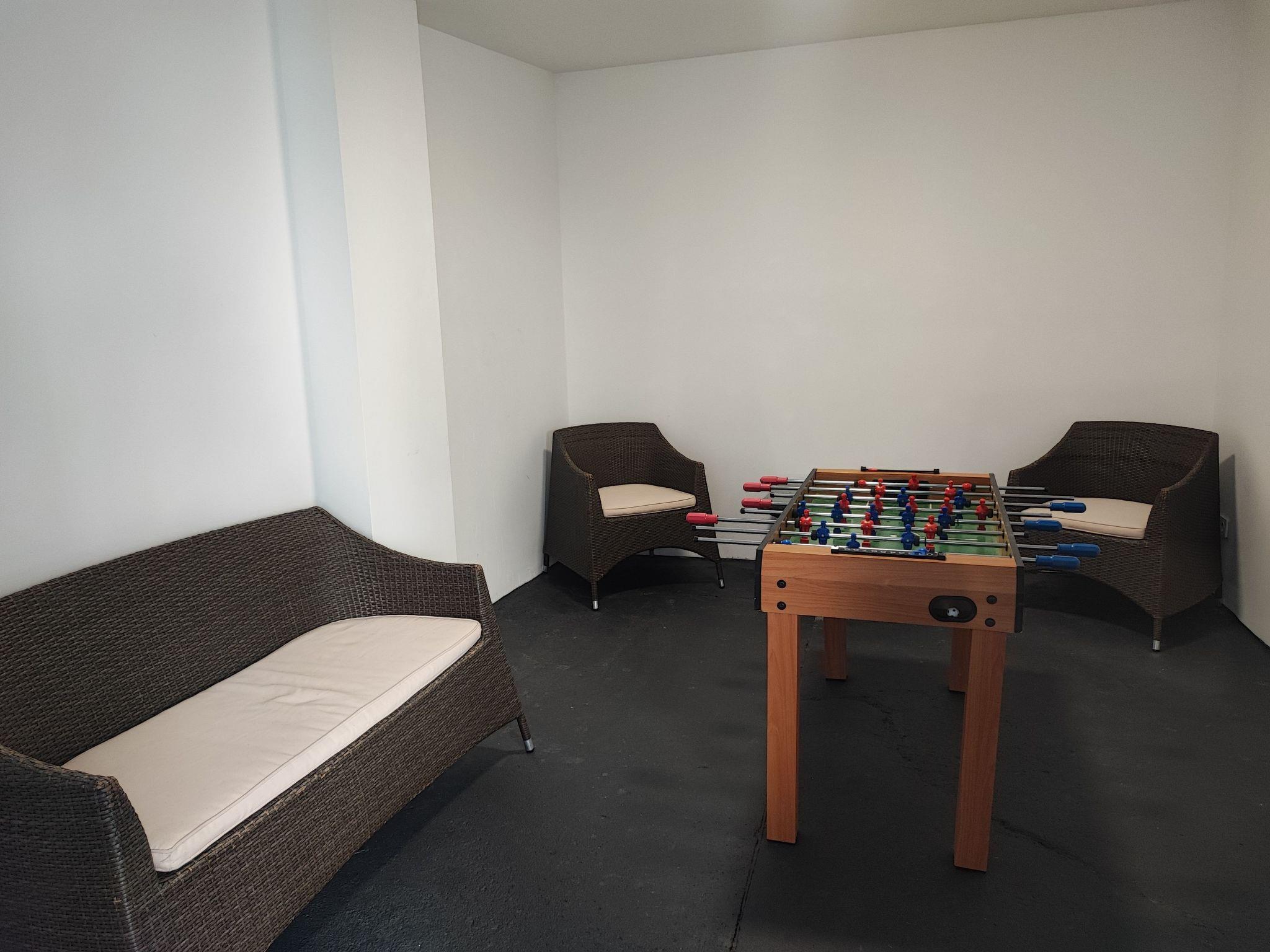 In the backyard you will find two cosy, covered seating areas and a barbecue area with an electric grill. The seating areas are freely available to all guests of the house. In a separate room there is a table football table, which may also be used by all guests in the house.