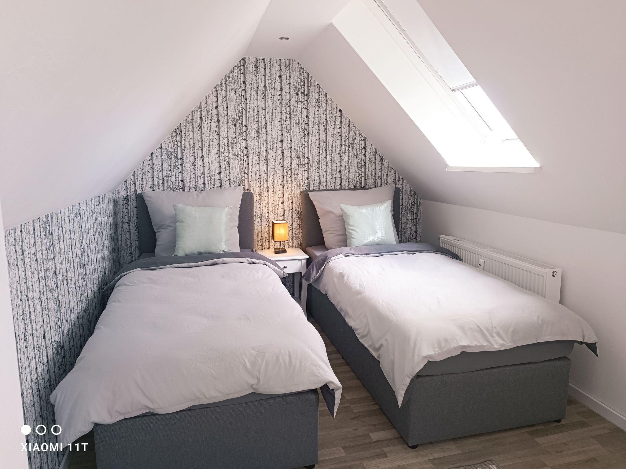 Bedroom two also has a large wardrobe with a full-length mirror and two box-spring beds with toppers (total size per bed 90cm) = the beds can also be pushed together to create a sleeping area of 180cm. Bedroom 3 is located in the converted attic. There are also two box-spring beds with toppers (total size per bed 90cm). An extra bed for a 7th person could be added here on request. A walk-in wardrobe offers enough storage space for clothes.