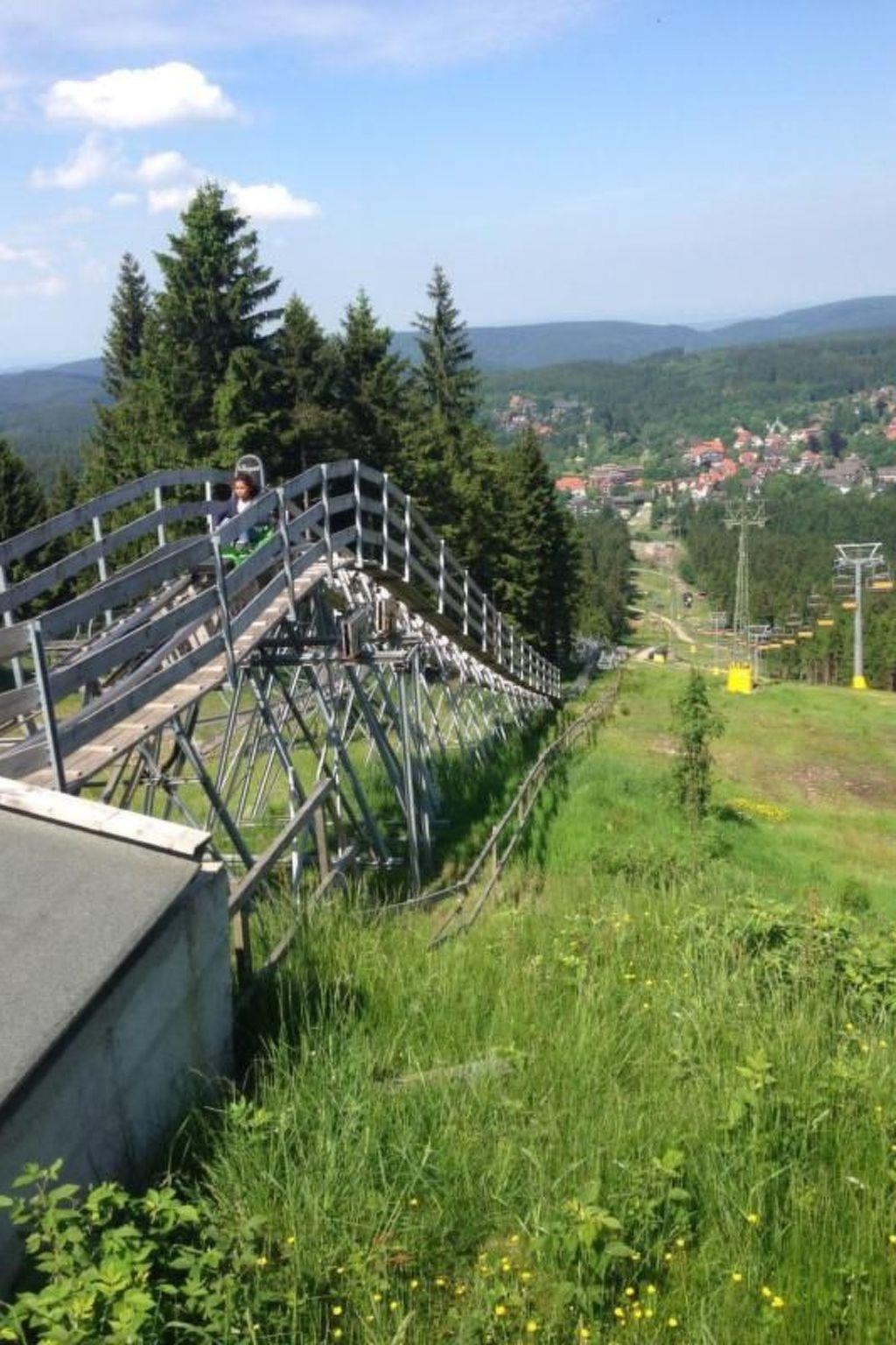 **The surrounding area - a paradise for nature and culture lovers**: The Harz Nature Park begins directly behind our holiday park with well-developed hiking trails that invite you to adventure. Hahnenklee, known as a natural paradise, offers attractions such as the Liebesbankweg. The UNESCO World Heritage town of Goslar is just a few kilometres away, and Clausthal-Zellerfeld with its renowned university is also within easy reach. For action lovers, the Bocksberg offers attractions such as the summer toboggan run, the Drachenblitz (opened in 2025) with 5 roundabouts, the dragon gorge and the giant dragon that watches over the gorge, Bocksbergcarts, tyre slide, Zipline Adventure (climbing park and high ropes course, adventure swing, witches' labyrinth, fun park with trampolines, slide tower, comet swing, a great playground and the bike park. If you prefer it more comfortable and don't fancy the climb, take the cable car or the 4-seater chairlift up the Bocksberg. In the Bocksberghütte, a self-service restaurant awaits you with tasty treats to enjoy in rustic surroundings or on the sun terrace with a phenomenal view over the landscape.