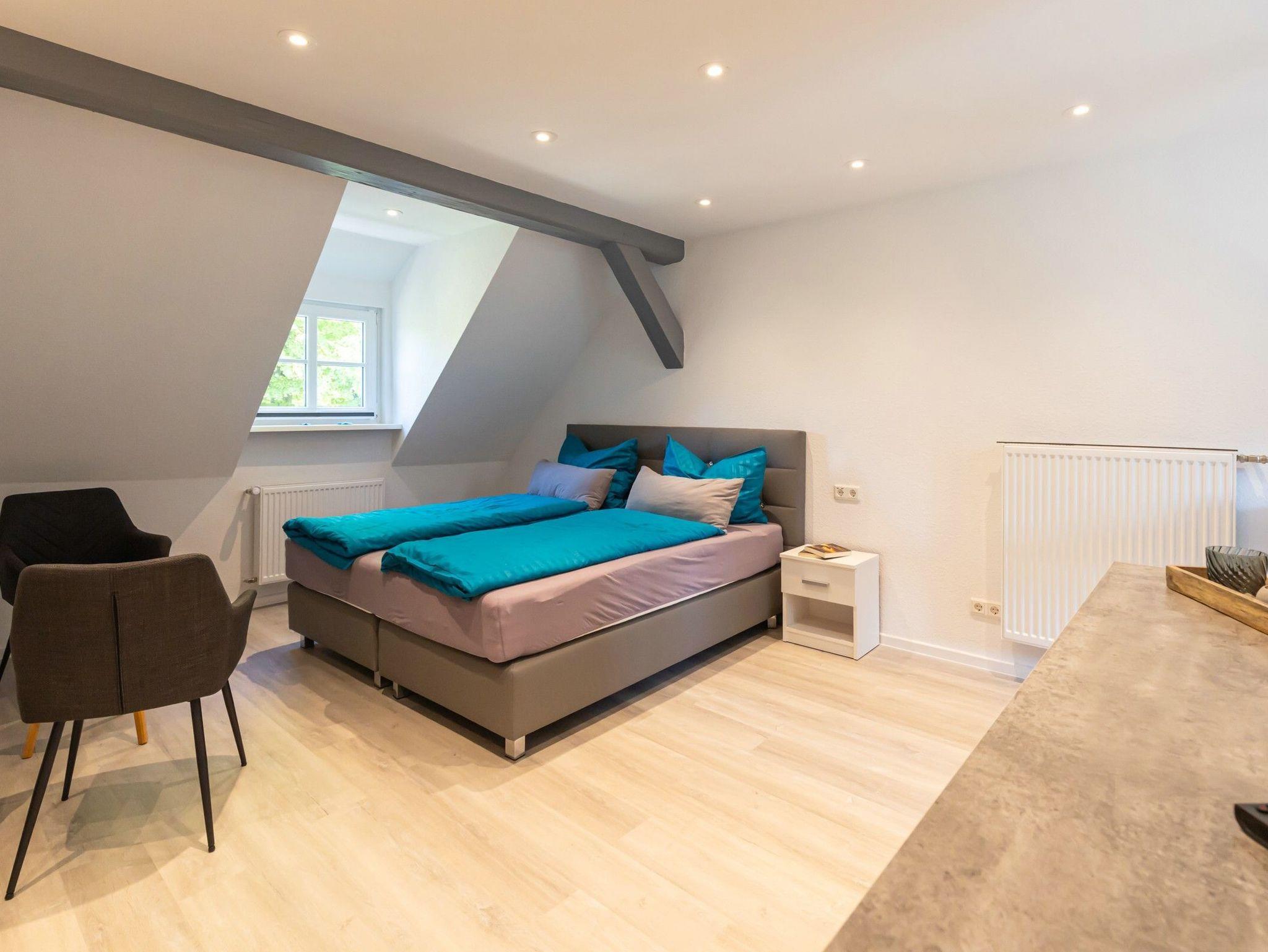 Dukatenzimmer Appartement mit einem Zimmer und offener Küche 33qm mit Blick über die Goslarer Altstadt. 2. Obergeschoss. Ein Duschbad mit Kopf- und Handbrause. Boxspringbett 180x200 cm mit Bettwäsche 155x220 cm.