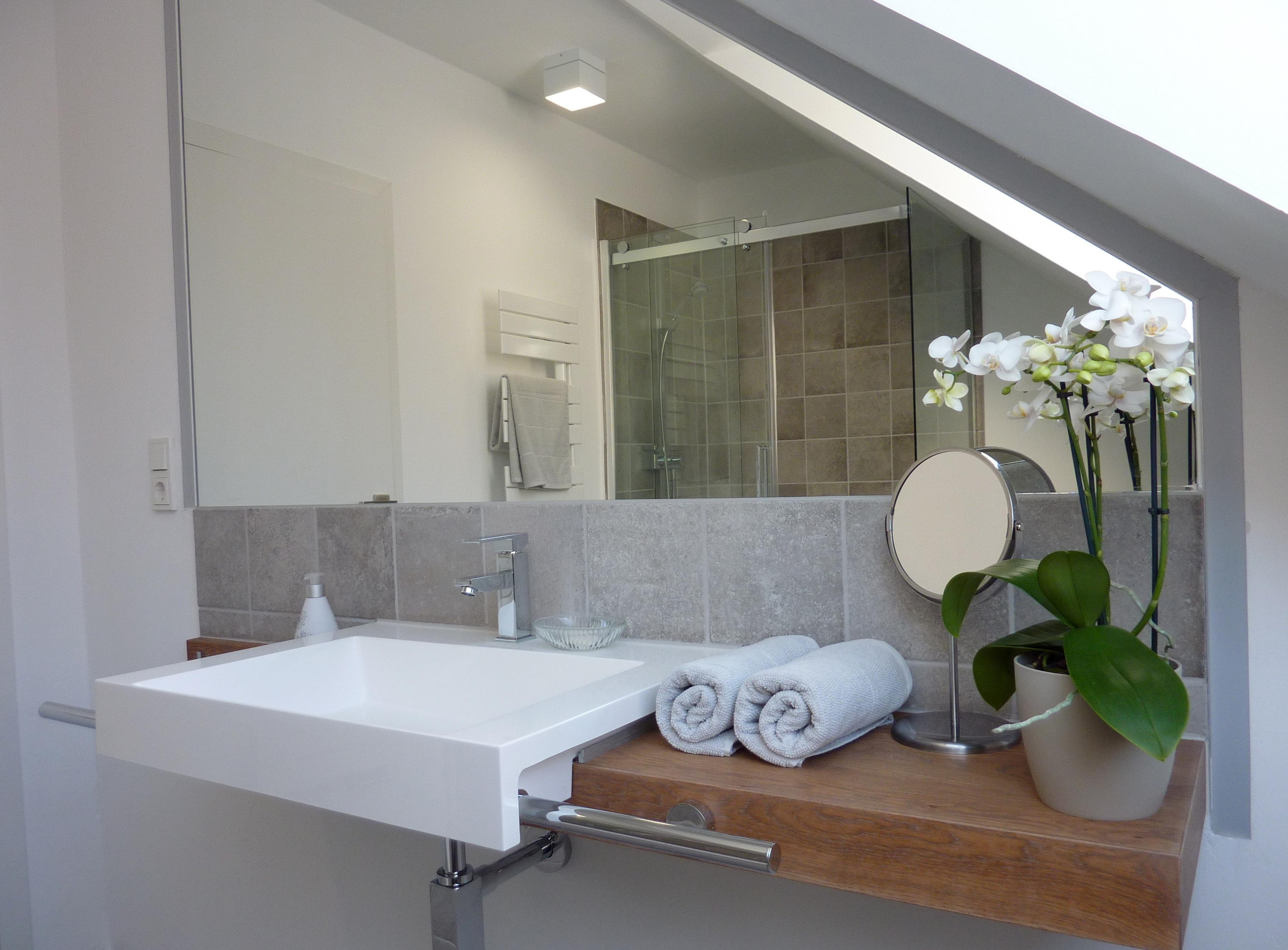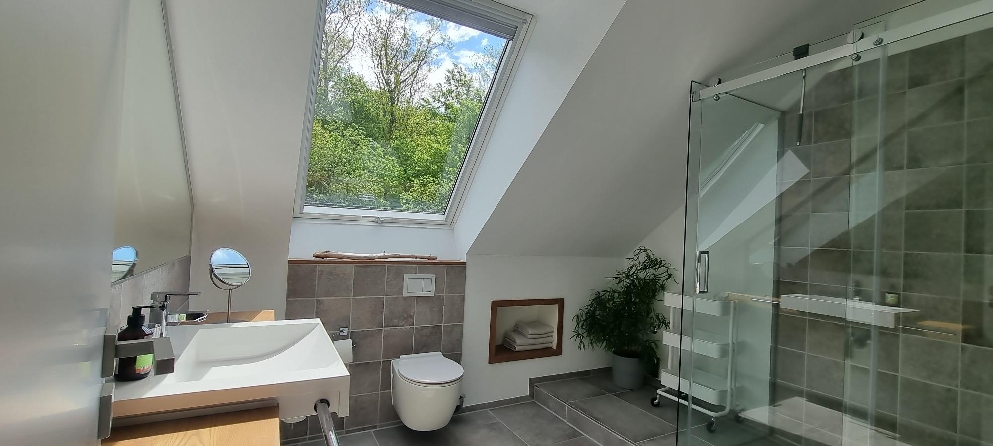 Großzügiges Bad mit geräumiger Dusche und großem Dachfenster mit Blick auf den Wald.