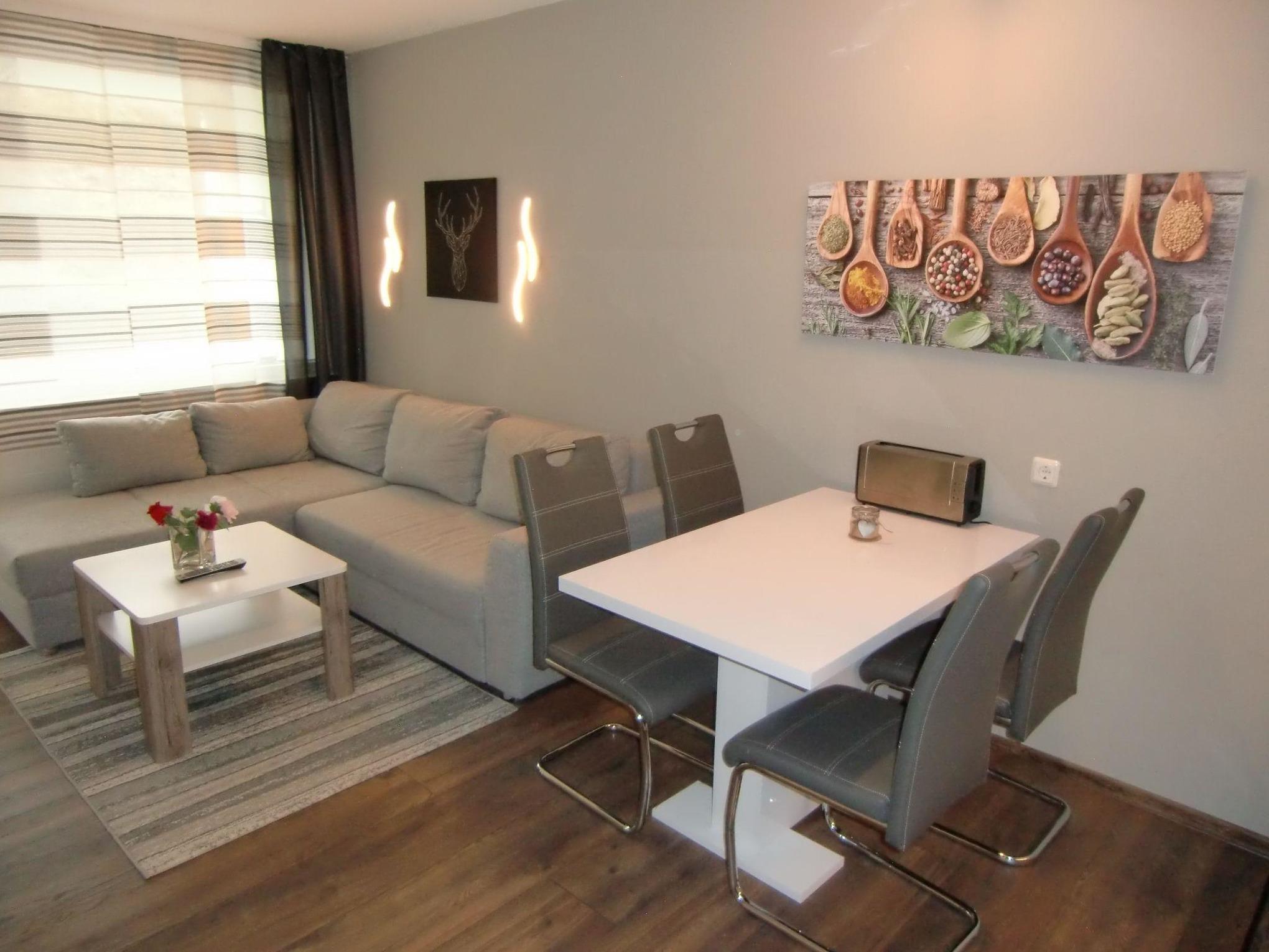 Die Ferienwohnung bietet eine komfortable und moderne Ausstattung, ideal für einen erholsamen Aufenthalt. Mit zwei Schlafzimmern, einem Doppelbett und zwei Einzelbetten, bietet sie genügend Platz für bis zu vier Personen. Die offene Küche ist voll ausgestattet mit einem Elektro-/Gasherd, Backofen, Kühlschrank, Geschirrspüler, Kaffeemaschine, Toaster und Wasserkocher. Das Duschbad wartet mit einem Wäschetrockner und einer Waschmaschine auf. Ein gemütliches Wohnzimmer mit Sofa, Sessel und Esstisch lädt zum Verweilen ein. Die Unterkunft ist barrierefrei und seniorengerecht gestaltet, ausgestattet mit einem Fahrstuhl für einfachen Zugang. WLAN-Internet ist verfügbar, und der Fernseher sorgt für Unterhaltung. Weitere Annehmlichkeiten wie Geschirr, Besteck, Geschirrtücher und ein Rauchmelder sind selbstverständlich vorhanden. Diese Wohnung garantiert eine angenehme Atmosphäre für einen unvergesslichen Aufenthalt.