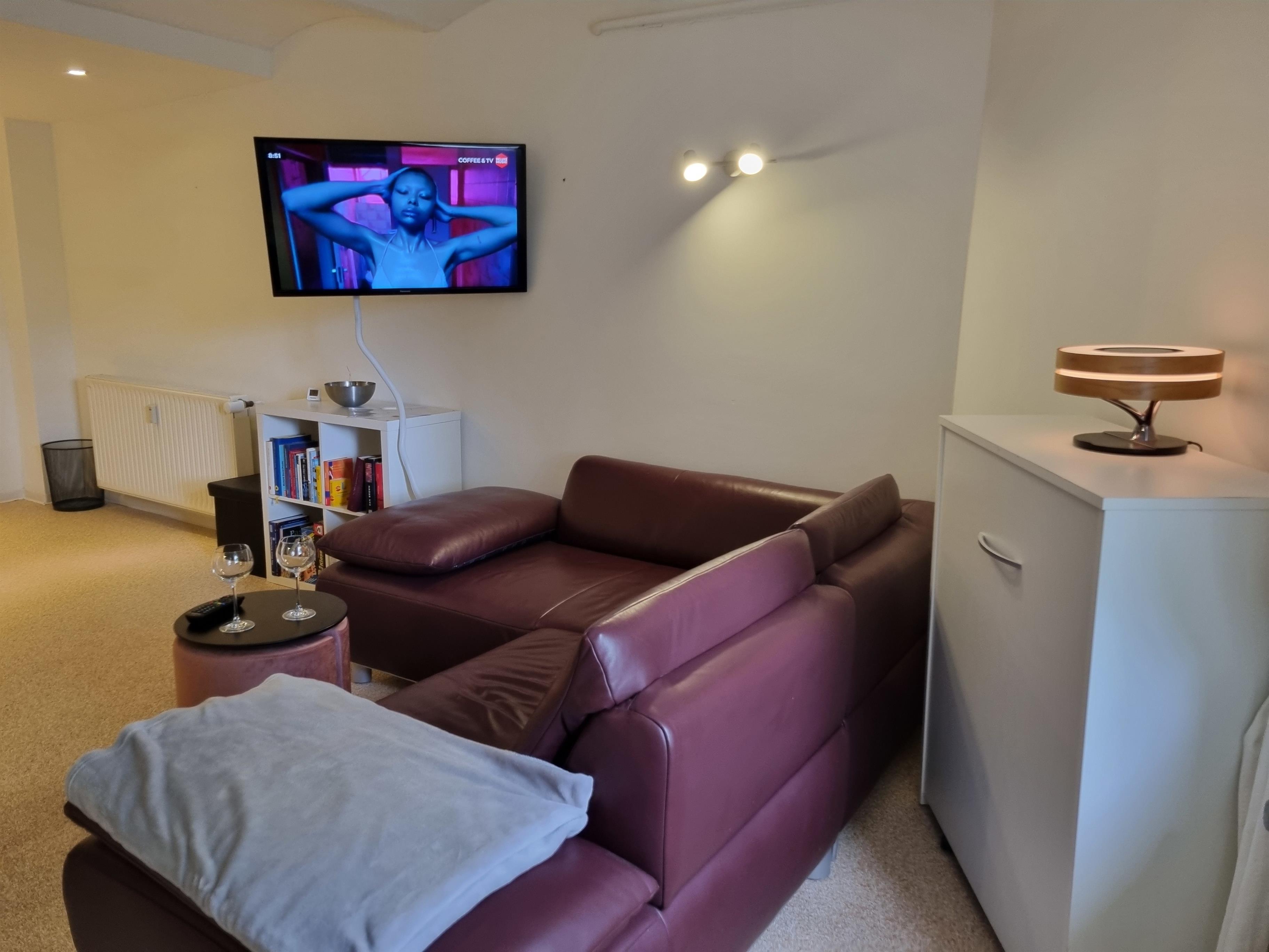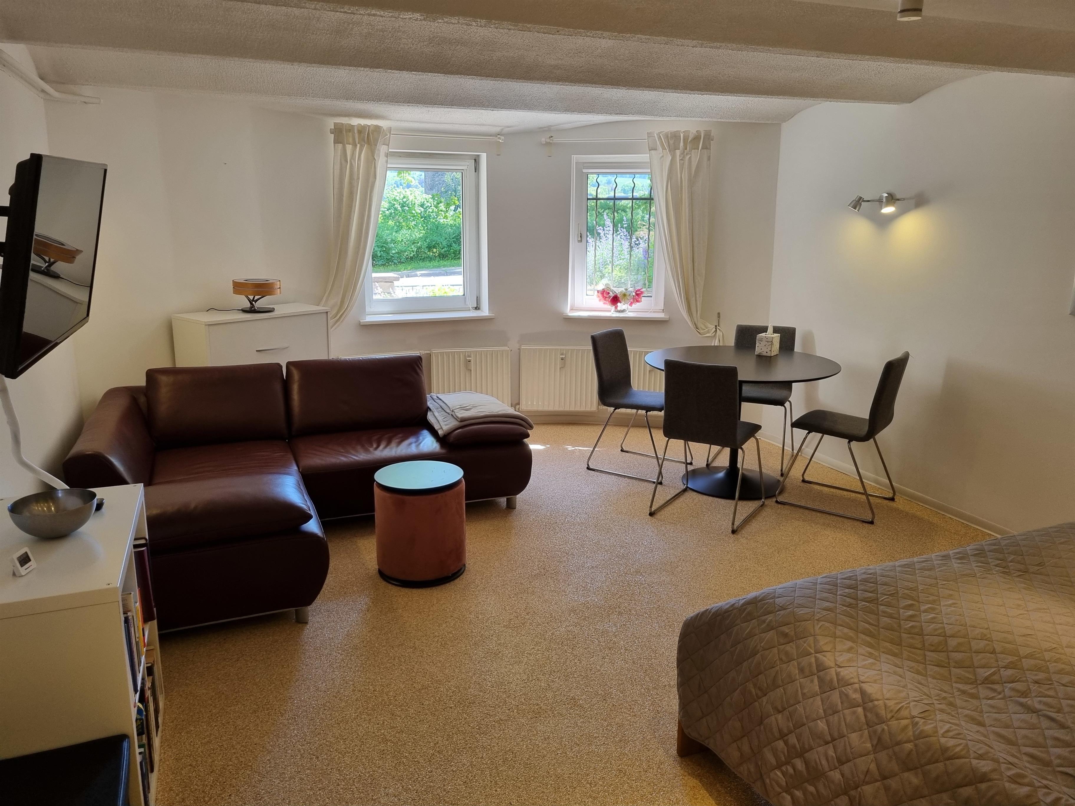 Im geräumigen Wohn-/Schlafraum lädt ein gemütliches Ledersofa zum Verweilen ein. Der schwenkbare TV ermöglicht hier und auch aus dem Bett gemütliche Fernsehabende. Die Badewanne und eine kleine Infrarot-Wärmekabine dienen nach Aktivitäten und bei schlechtem Wetter der Entspannung.