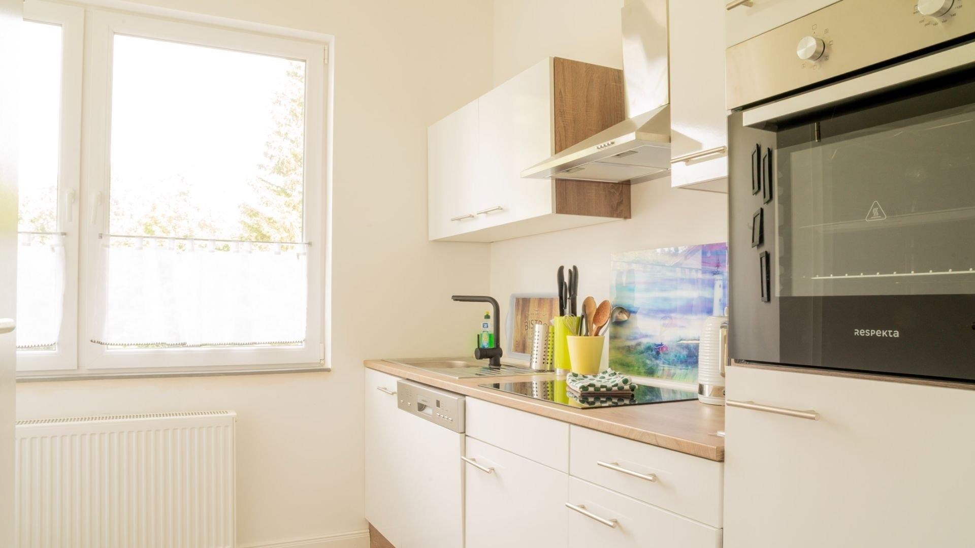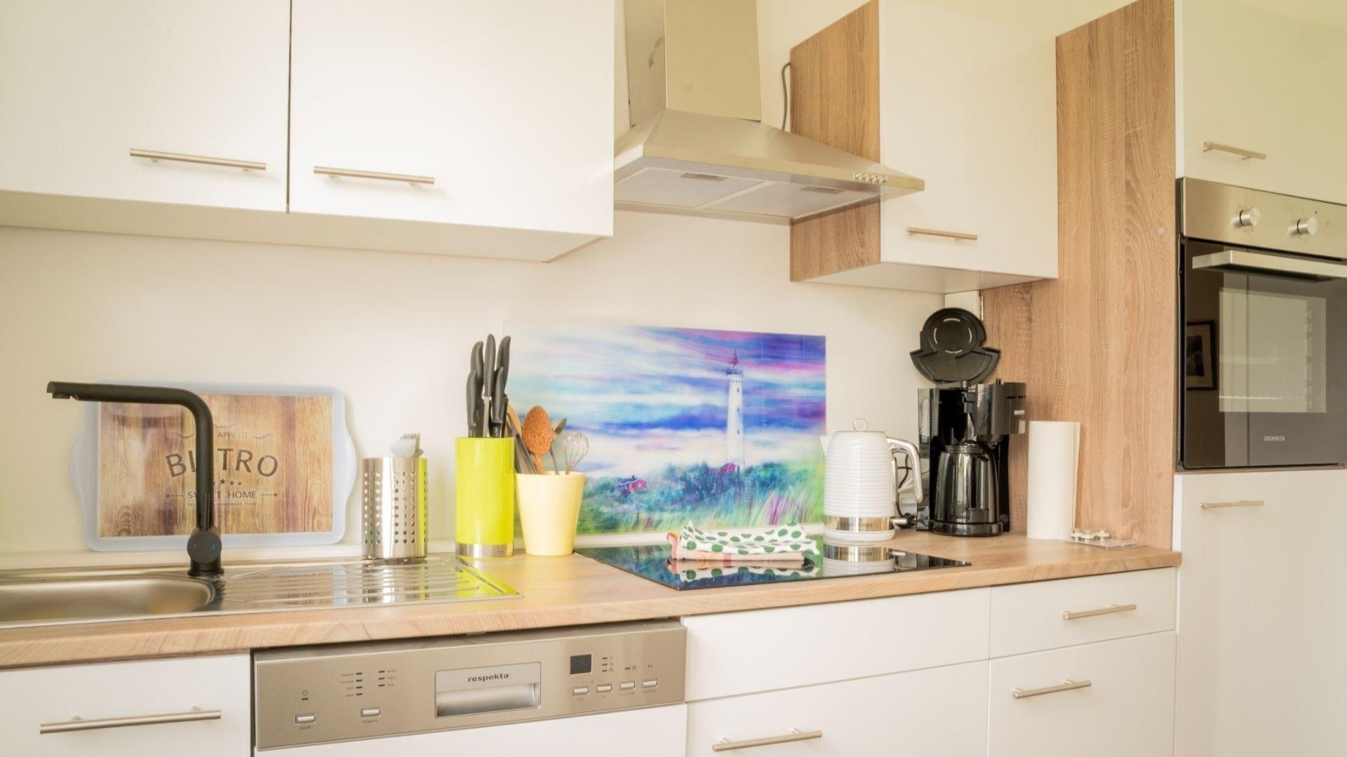* Moderne vollausgestattete Küche mit Geschirrspüler, Kühlschrank mit Gefrierfach, Backofen und Induktionsplatten