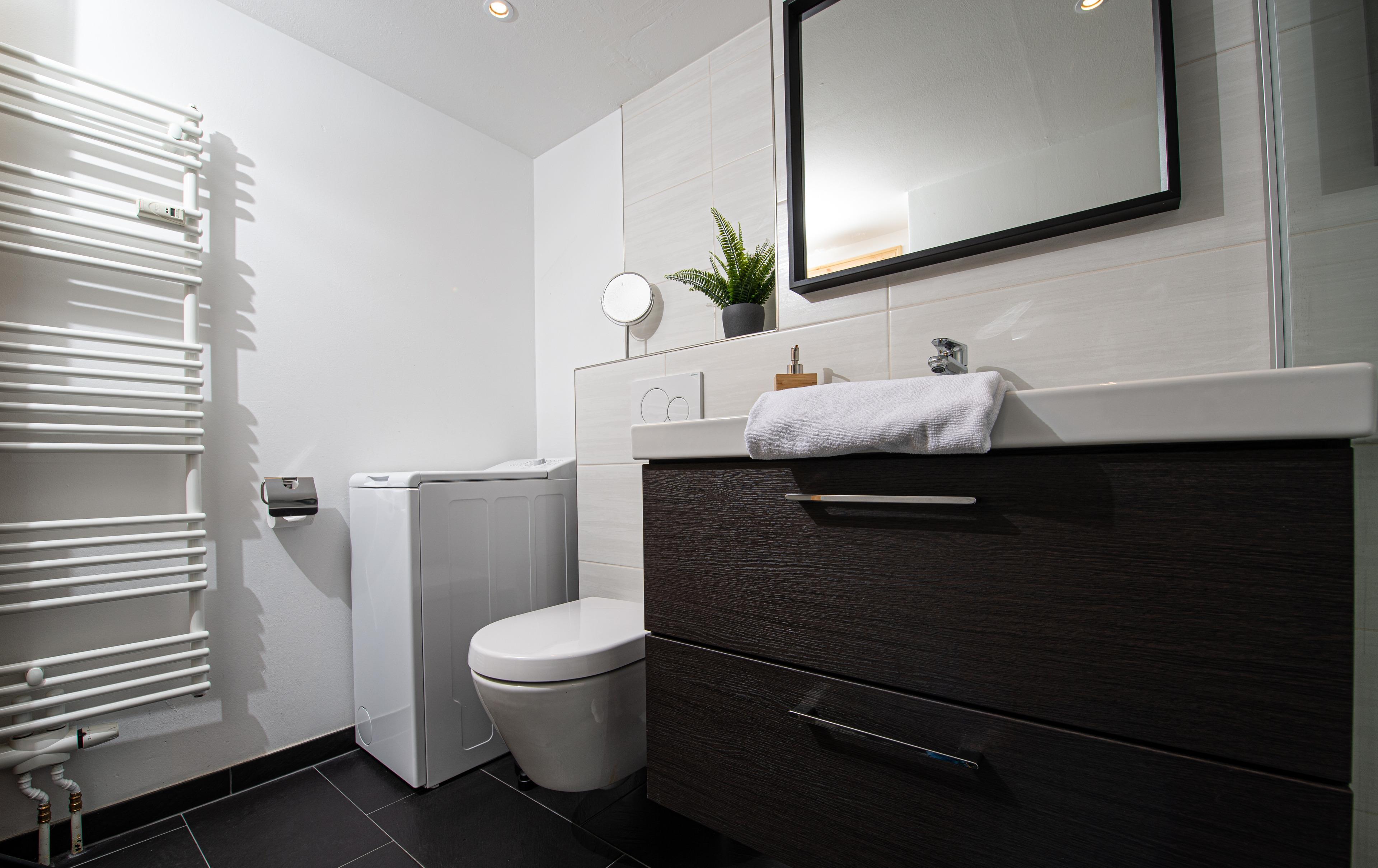 Im großzügigen Badezimmer mit großer offener Walk-In-Dusche und einem großen Waschbecken, ist der ideale Ort der Entspannung nach einem ereignisreichen Urlaubstag. Im Badezimmer befindet sich außerdem eine Waschmaschine.