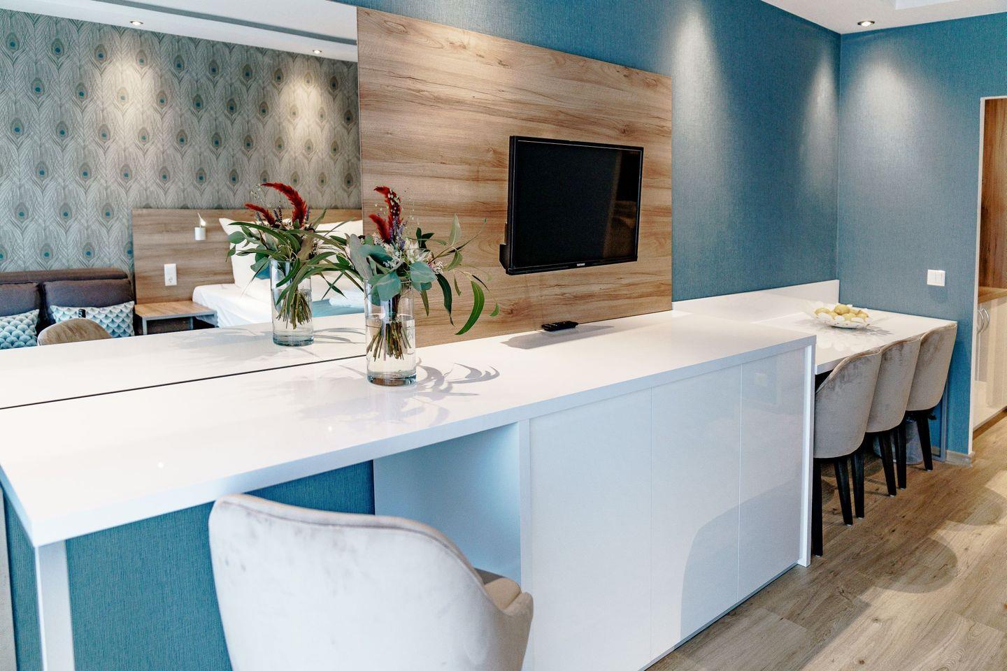Die voll ausgestatteten Ferienwohnungen sind geprägt von einer harmonischen Farbkombination in der Sie sich garantiert wohlfühlen werden und es Ihnen an nichts fehlen wird. Vom Balkon aus genießen Sie eine Panoramaaussicht, wahlweise auf den See oder den berühmten Bocksberg. Die bequemen Balkonmöbel laden zum Verweilen mit ihren Liebsten ein.