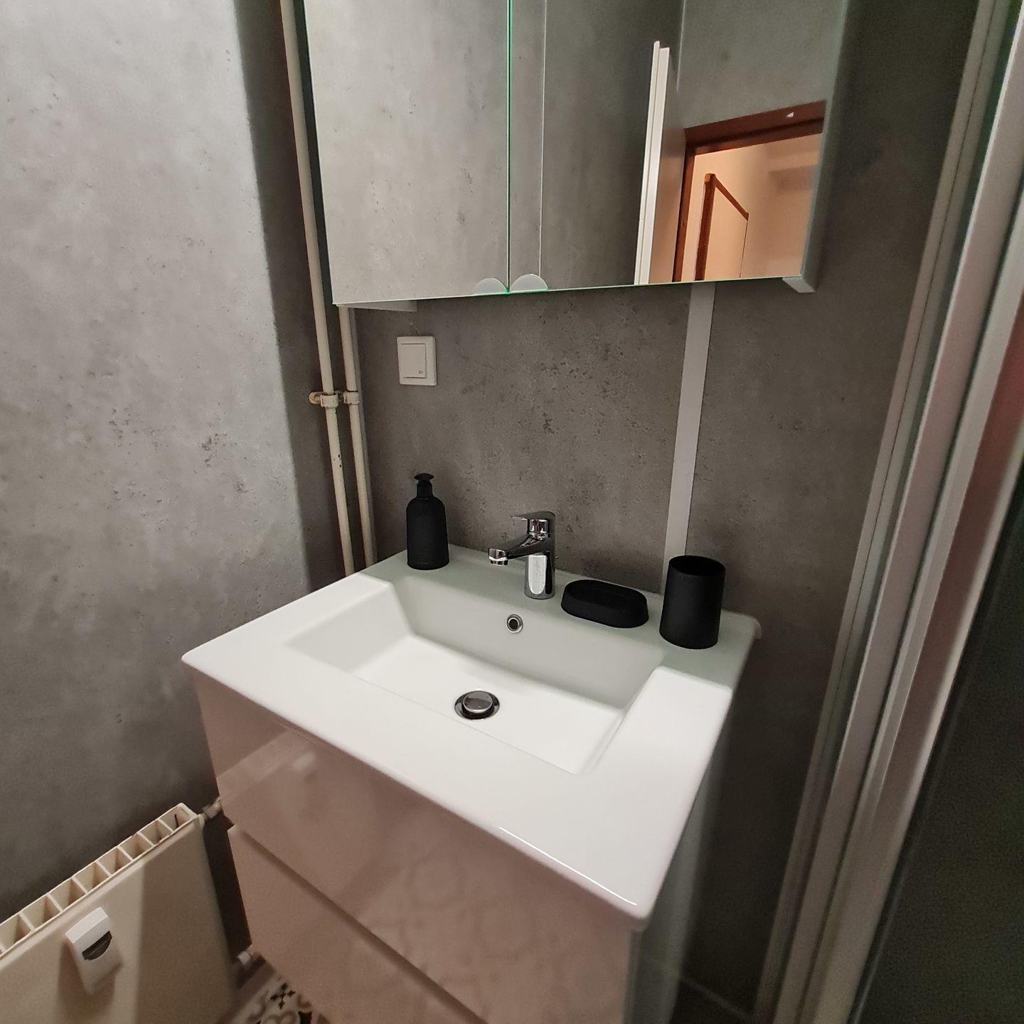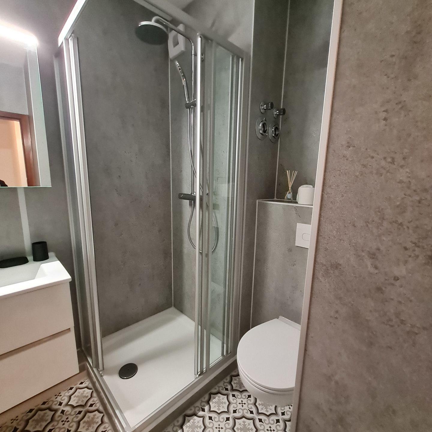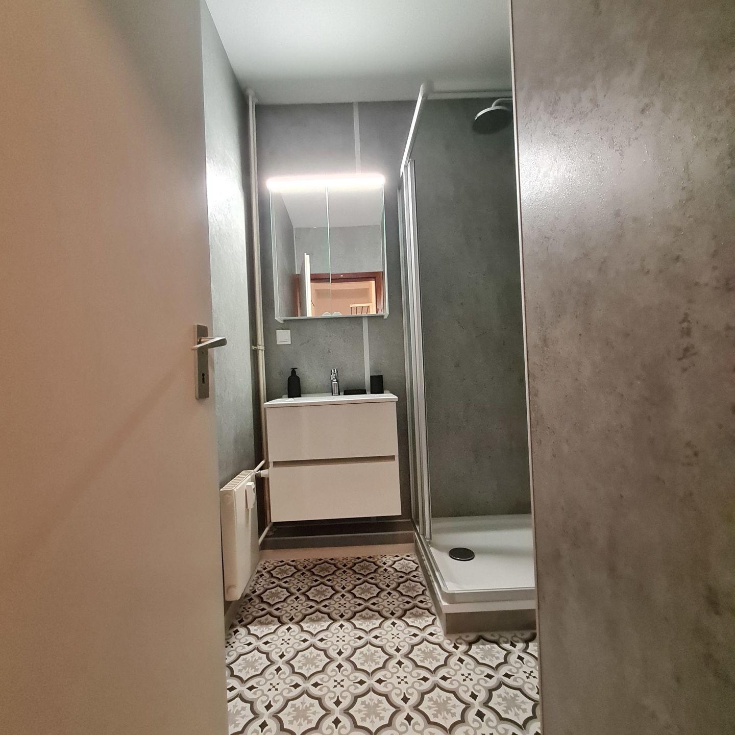 Das Badezimmer hat eine Dusche und einen Spiegelschrank.