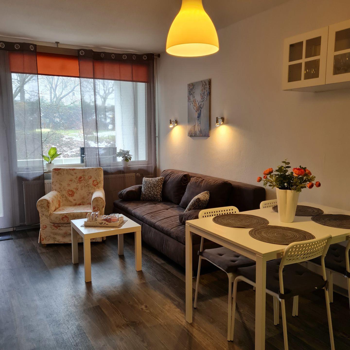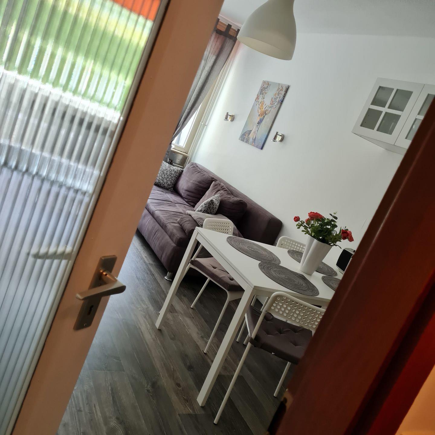 Zu der gemütlich eingerichteten Ferienwohnung gehören zwei Schlafzimmer, ein Badezimmer mit Dusche sowie ein Wohn-/ Essbereich mit einer offenen Küche die mit Kühlschrank, Geschirrspülmaschine, 2-Platten-Herd, Mikrowelle, Kaffeemaschine, Wasserkocher und vielem mehr ausgestattet ist.