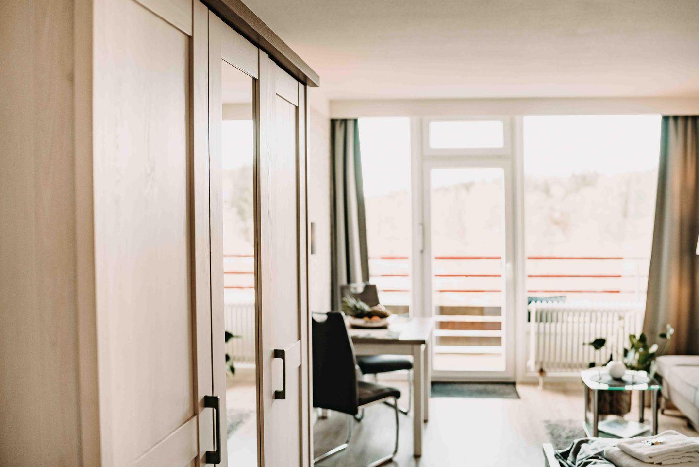Helles und modern eingerichtetes 1-Raum-Appartement mit sehr gut ausgestatteter Küche und Balkon mit Seeblick im Zentrum von Hahnenklee