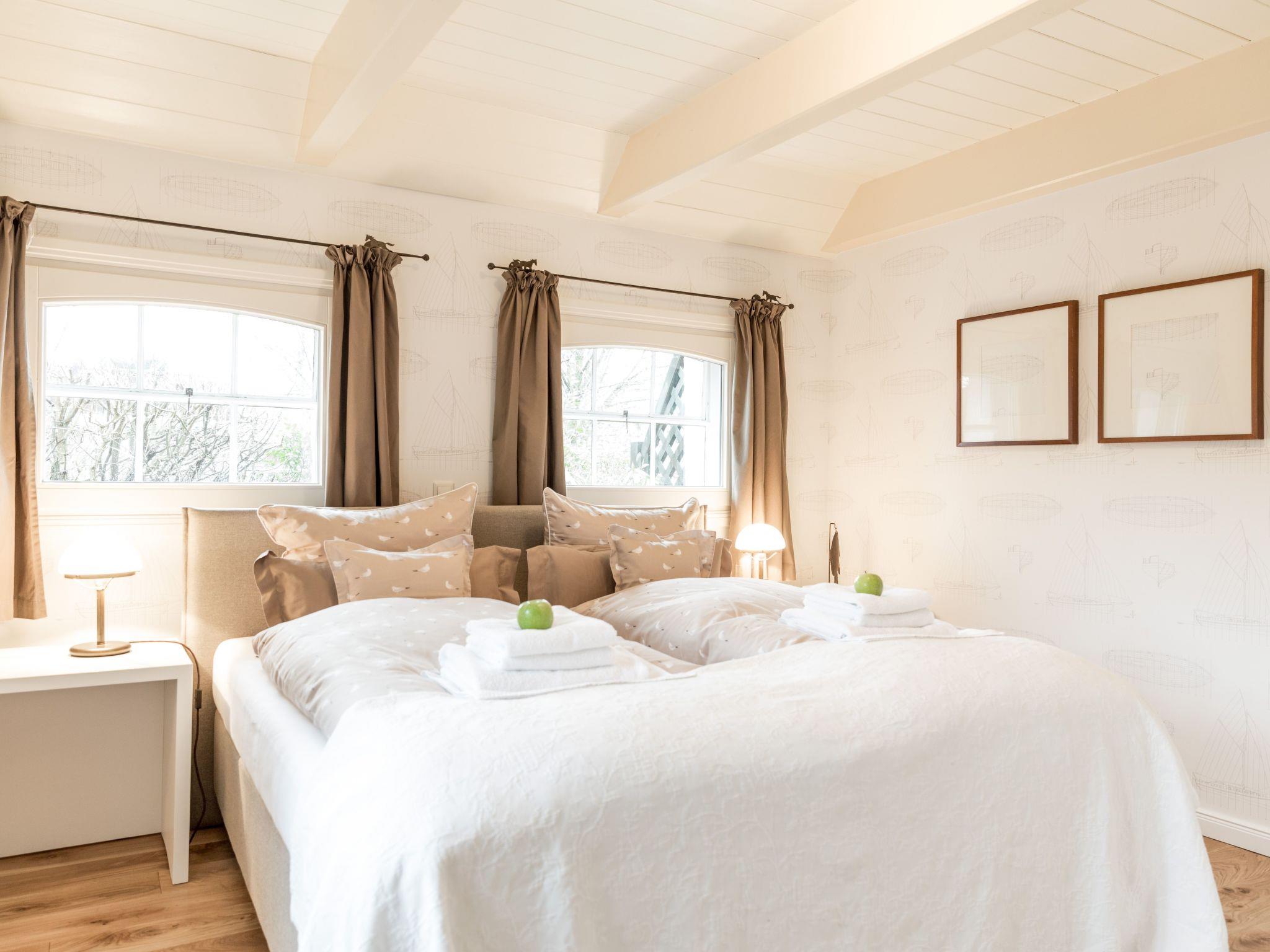 We have also furnished this house with great attention to detail: the living room is divided into a cosy sitting area and a library with a large selection of books and a cosy wood-burning stove. The large dining table adjoins the fully equipped kitchen. Couples or families with children like to holiday here, as there is one bedroom with a daylight bathroom on the ground floor and the other two bedrooms with daylight bathrooms on the upper floor. The unusual floor plan is the result of the optimal layout of the listed building. You can enter the adjoining private garden through the living room, where you have a terrace with seating and your own beach chair in a manageable space. There are also two deckchairs for relaxing in the garden.