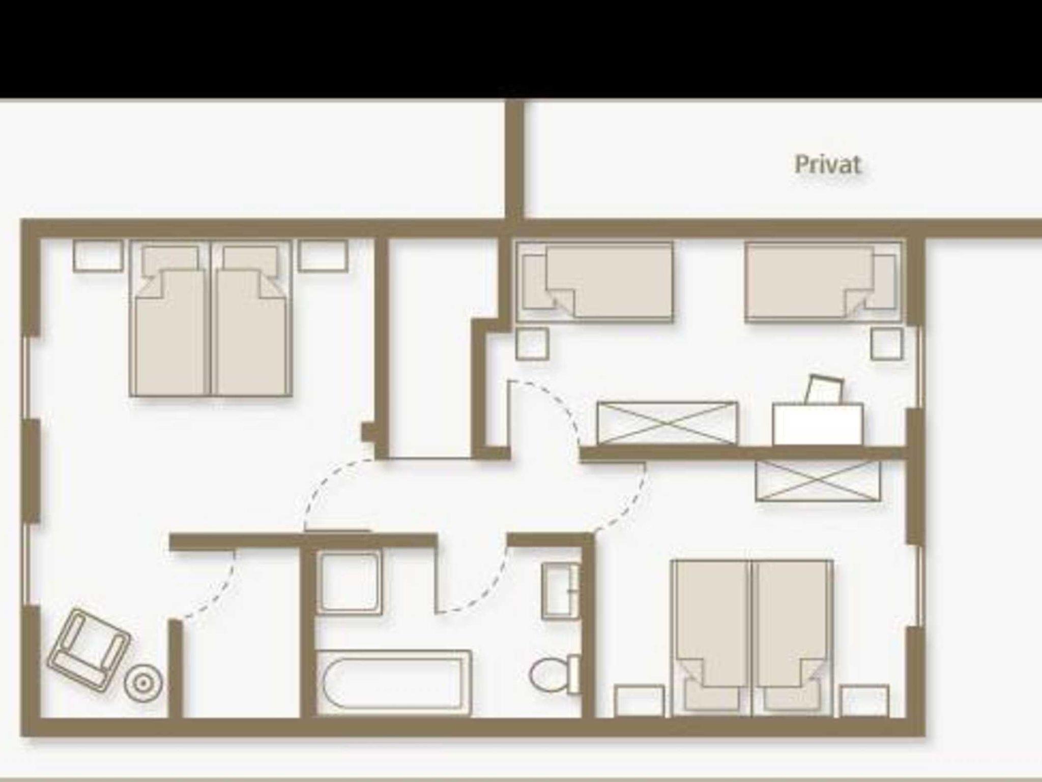 Raumaufteilung: 1 Schlafraum (1 Doppelbett), 1 Schlafraum (1 Doppelbett), 1 Schlafraum (2 Einzelbetten), 1 Wohnraum, 1 separate Küche, 1 Badez. mit Dusche und Wanne, 1 Badezimmer mit Dusche, 1 Abstellkammer.