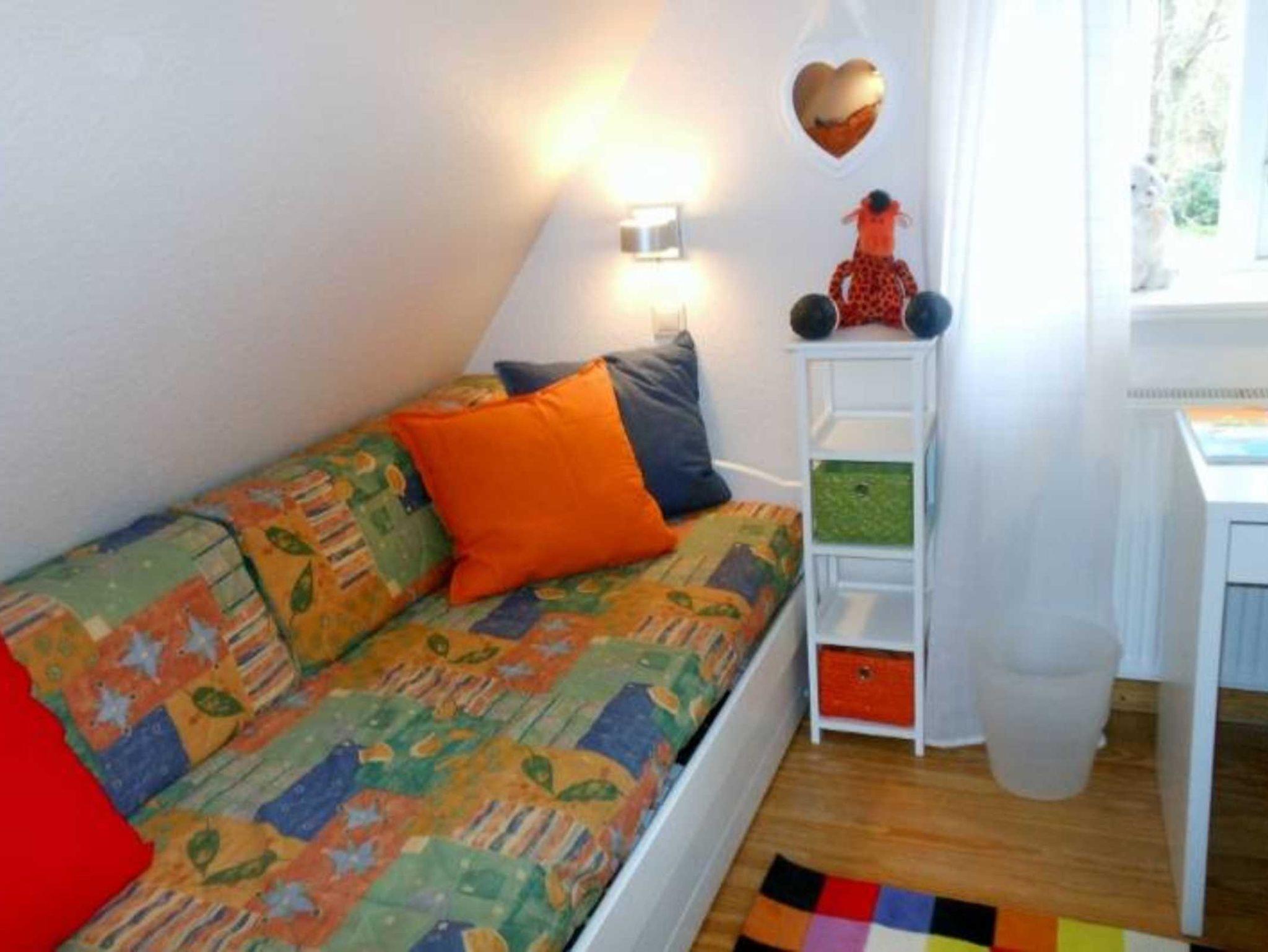Das Haus bietet Ihnen im Erdgeschoss ein grosses Wohnzimmer mit Kamin und warmen Holzfussboden , direkter Zugang zum abgeschlossenen Garten und Essbereich. Eine grosse separate Küche mit Geschirrspüler, Ceranfeld, Espressomaschine, Kühlschrank mit Tiefkühlfach und Essbereich, Ein grosszügigen Flu, Gäste WC mit Dusche und Hauswirtschaftsraum mit Waschmaschine und Trockner. Im Obergeschoss über die Holztreppe mit Treoppenschutzgitter gelangen Sie zu den Schlafzimmern, alle mit warmen Holzfussböden versehen. Das Elternschlafzimmer mit Doppelbett mit Blick in den Garten, einem begehbarem Kleiderschrank und Fernseher. Das grosse Badezimmer mit Badewanne und separater Dusche und WC. Zweites Schlafzimmer mit Doppelbett, das 3 Zimmer mit zwei Einzelbetten und Schreibtisch. Der grosse Garten bietet Platz zum Toben der Kinder oder Ihrem Haustier. Fahrräder können im Fahrradschuppen verstaut werden.