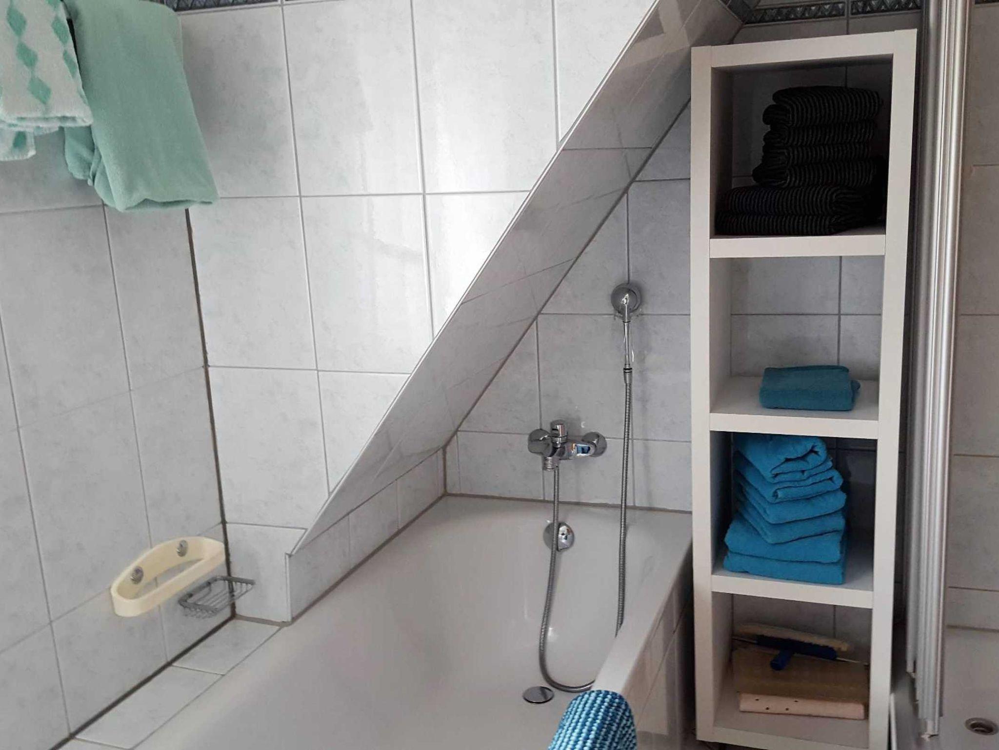 Sanitär: Föhn, Handtuchheizkörper, Schminkspiegel.