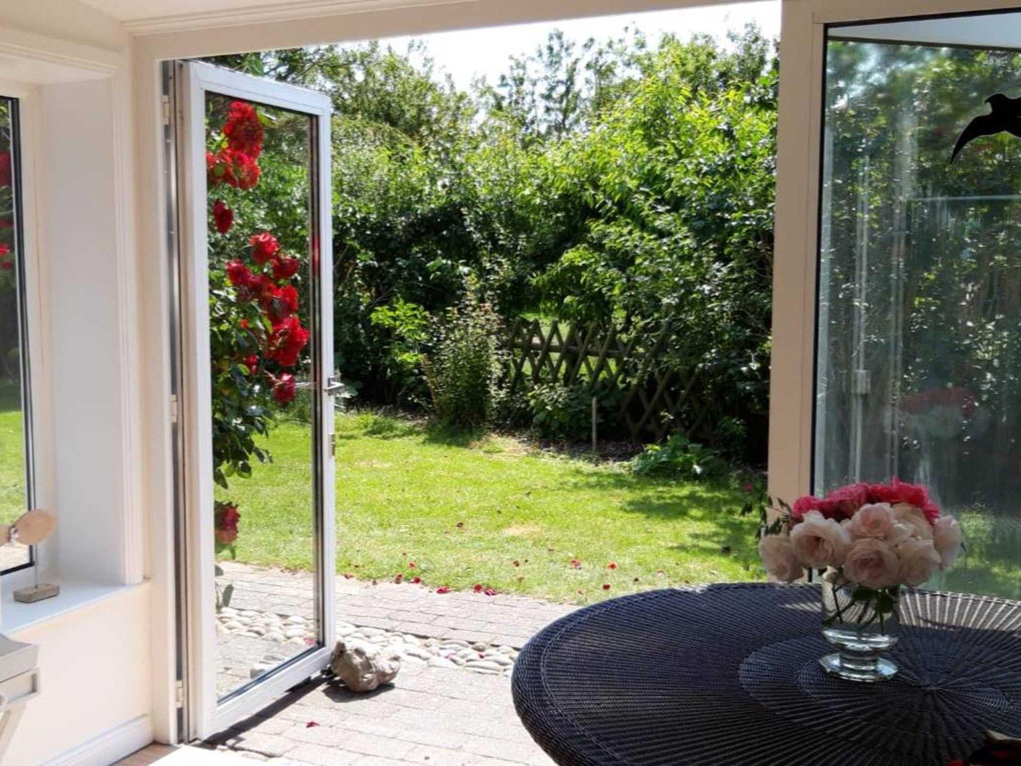 Wohnbereich mit Kamin und Zugang zum Garten. Strandkorb, Gartenmöbel warten auf Sie, damit sie relaxen können. In diesem Nichtraucherhaus sind sind keine Haustiere erlaubt.