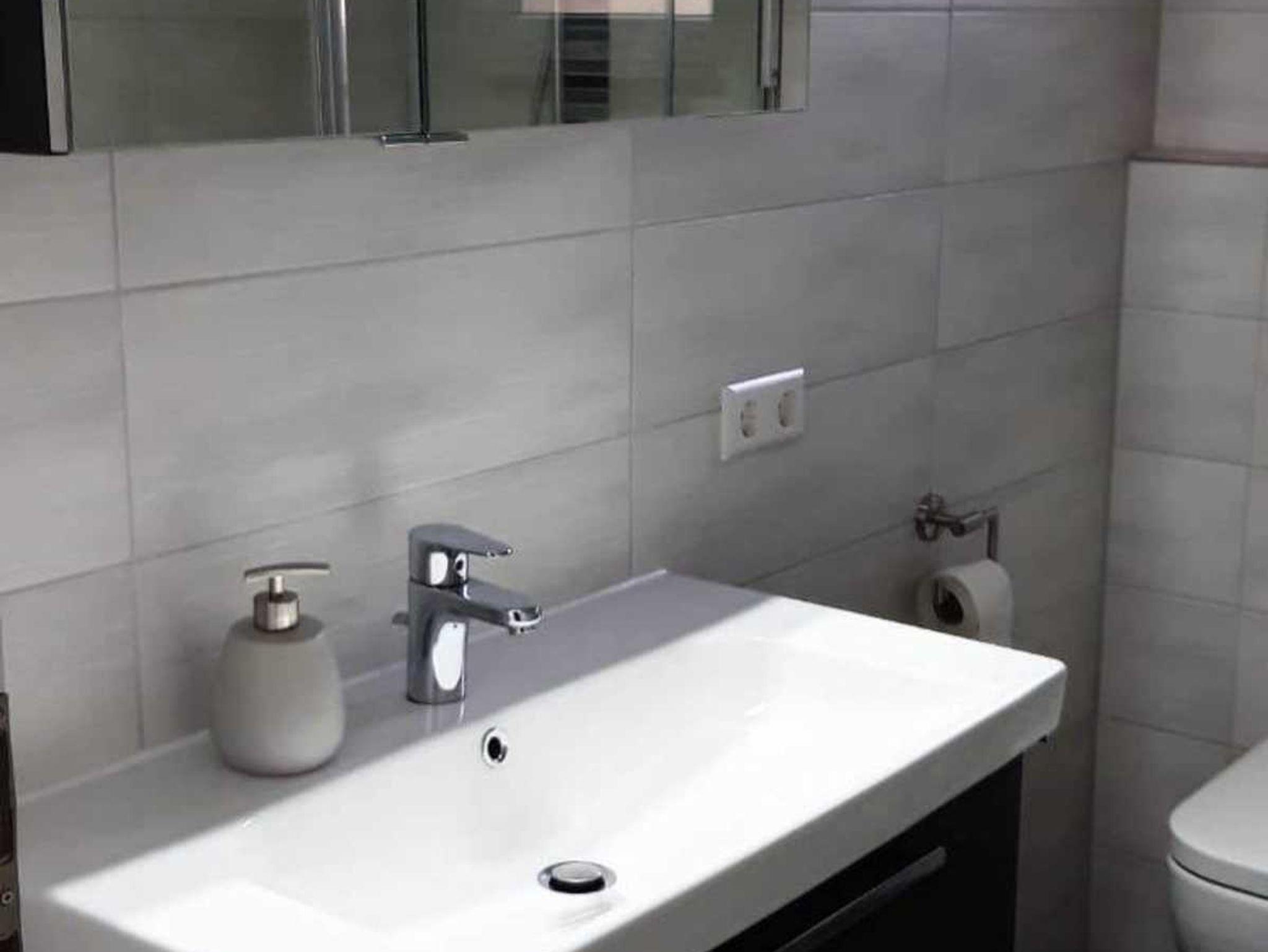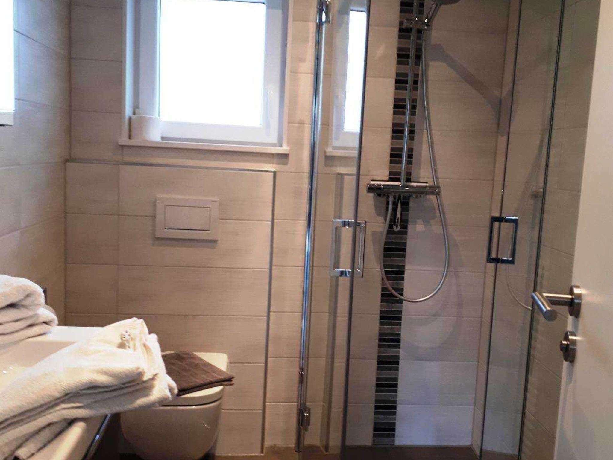 Sanitär: bodenebene Dusche, Föhn, Handtuchheizkörper, Schminkspiegel.