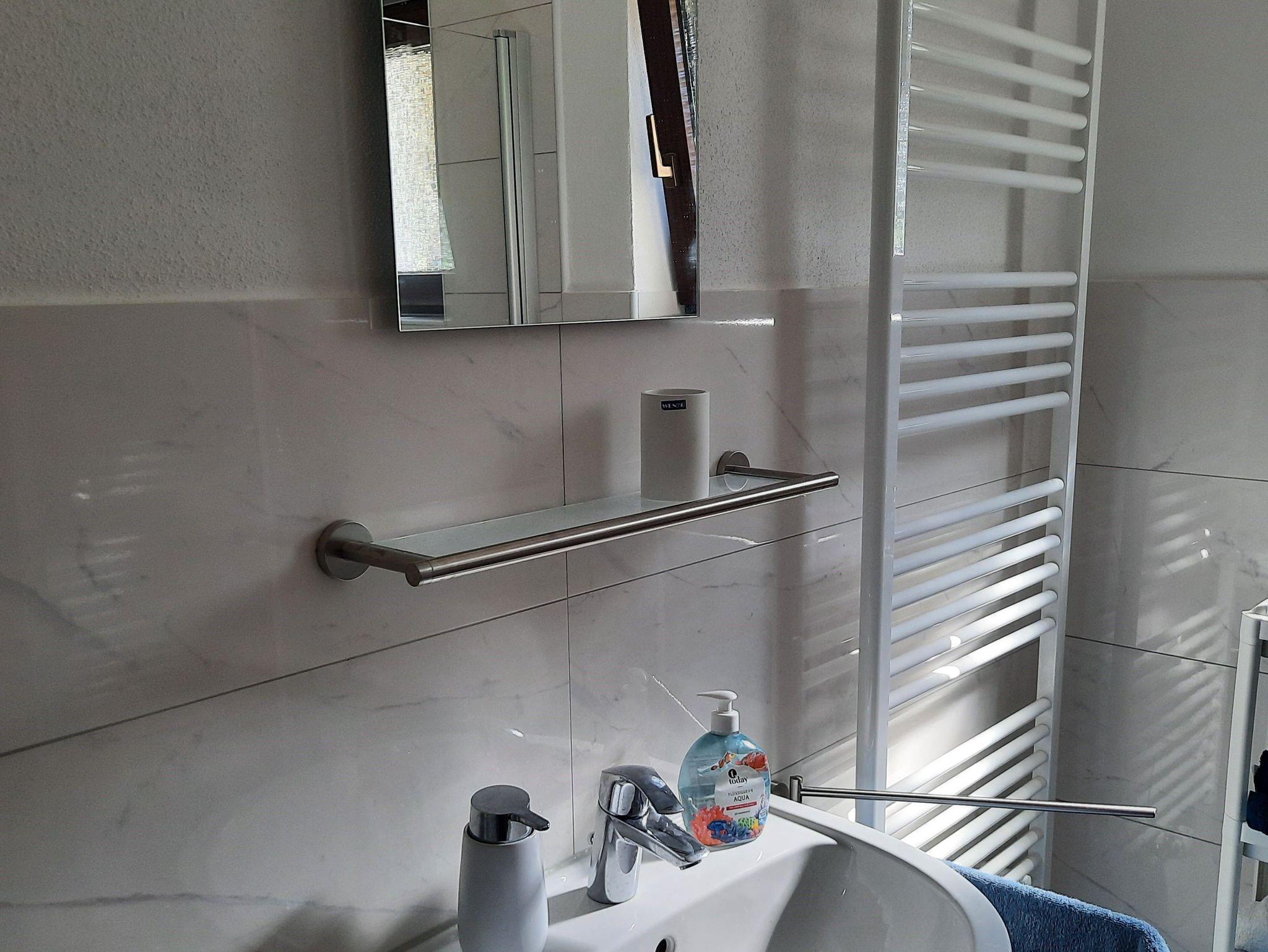 Das Badezimmer verfügt über einen ebenerdigen Zugang zur Dusche, WC und Waschbecken mit beleuchtetem Spiegel. Föhn, Bade- und Handtücher sowie Seife und Toilettenpapier werden gestellt.