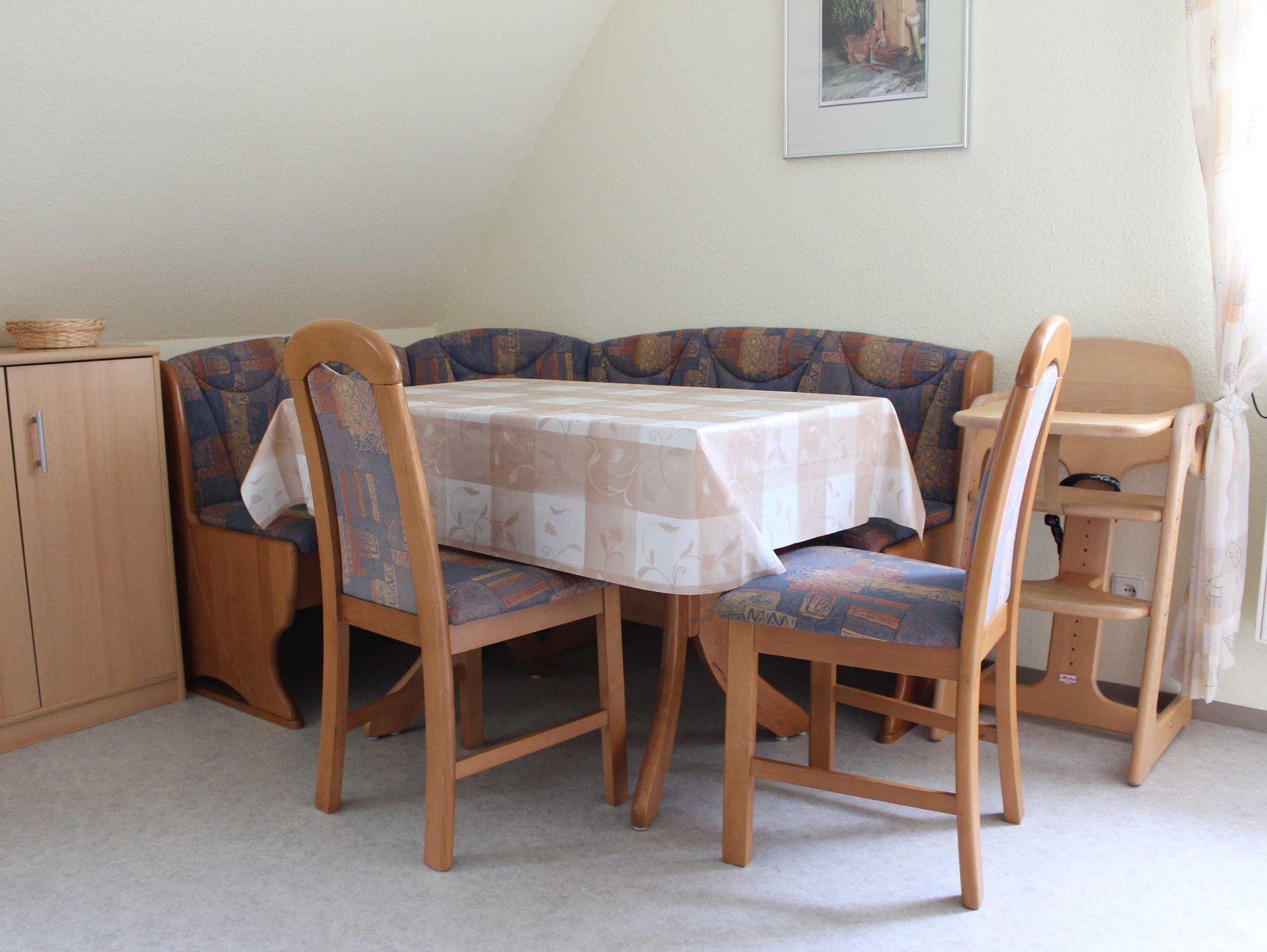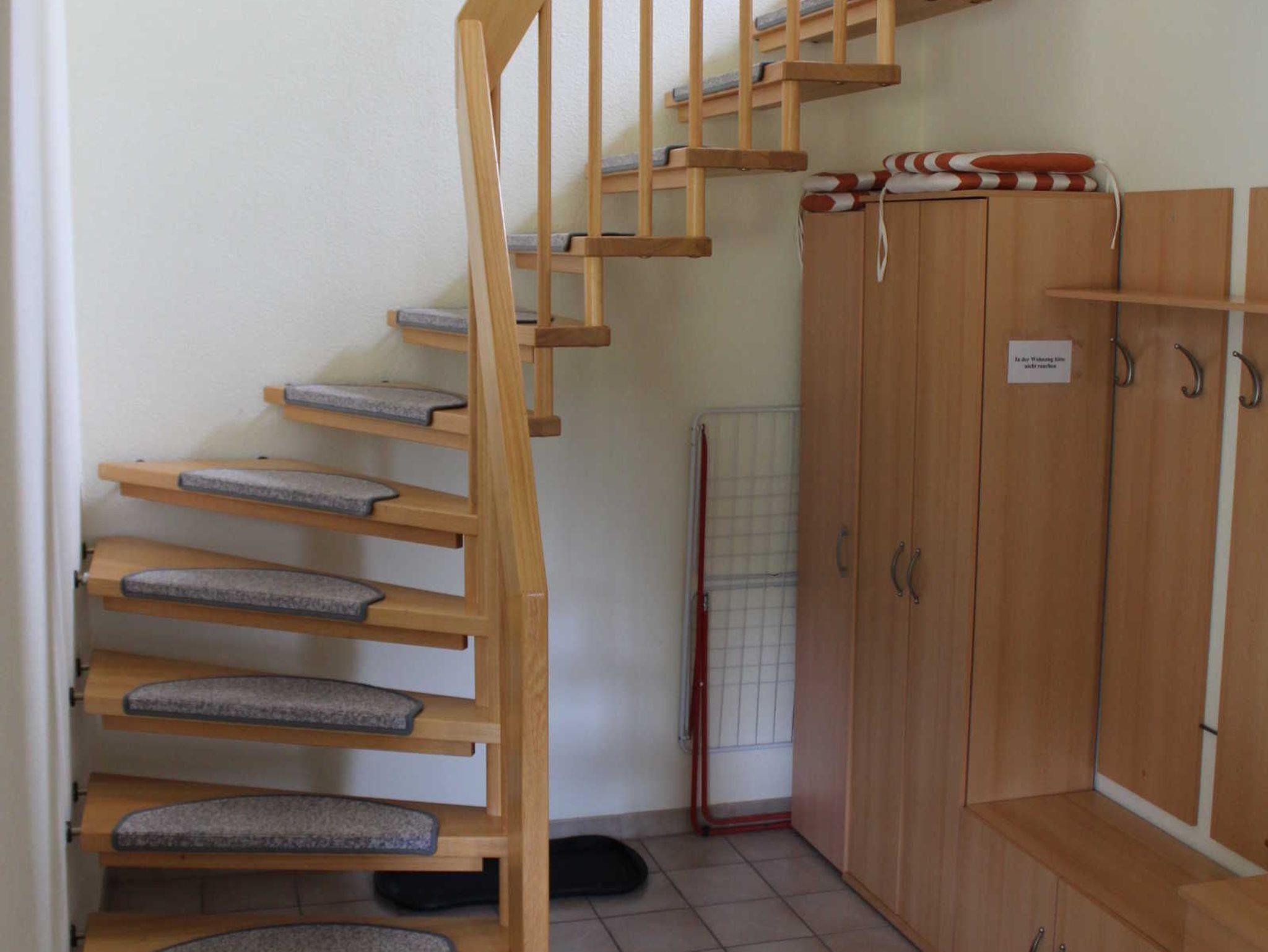 Die Ferienwohnung verfügt auf zwei Stockwerken über ein großes, helles Wohnzimmer, eine voll ausgestatteten Küche mit Sitzecke und einem Bad mit Badewanne und WC. In der oberen Etage finden Sie ein Schlafzimmer mit Doppelbett und ein weiteres Zimmer mit zwei Einzelbetten, sowie ein separates WC. Das Aufstellen eines Kinderbettes ist in beiden Schlafzimmern möglich. Täglich frische Brötchen auf Anfrage vor Ort.