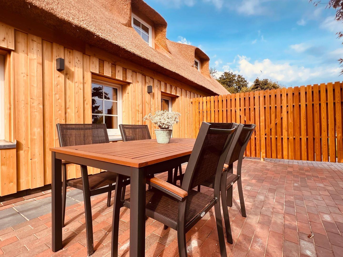 Genießen Sie die Sonne auf Ihrer eigenen Terrasse mit Südausrichtung, ausgestattet mit Gartenmöbeln, Sonnenschirm und Windschutz. Der Gemeinschaftsgarten lädt zum Verweilen ein, während die Gartensauna (Fasssauna - kostenpflichtig - 8,00 € pro Stunde) zur gemeinsamen Nutzung bereitsteht (Münzautomat)– ideal für entspannende Stunden nach einem aktiven Tag. Bitte beachten Sie, dass das Grillen aufgrund des Reetdaches nicht gestattet ist.