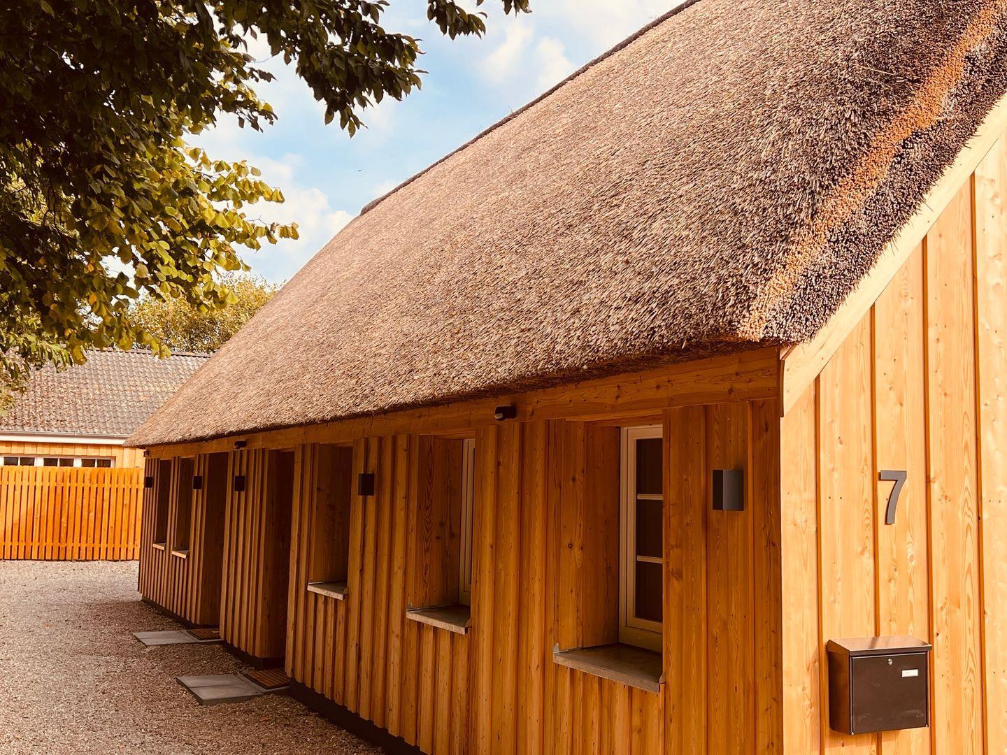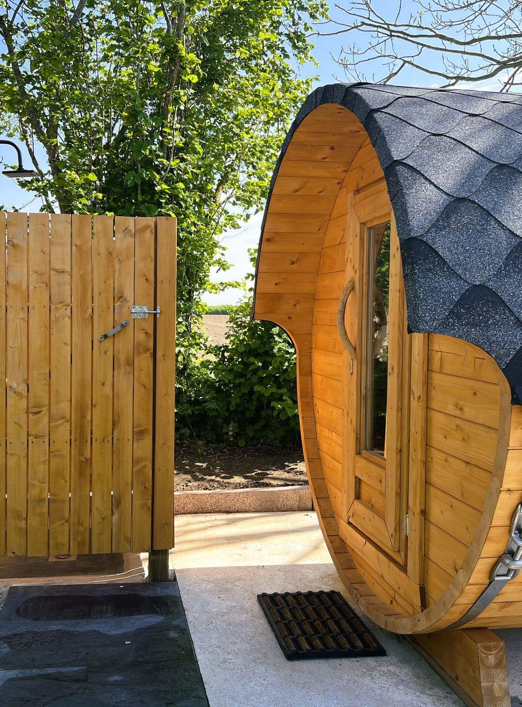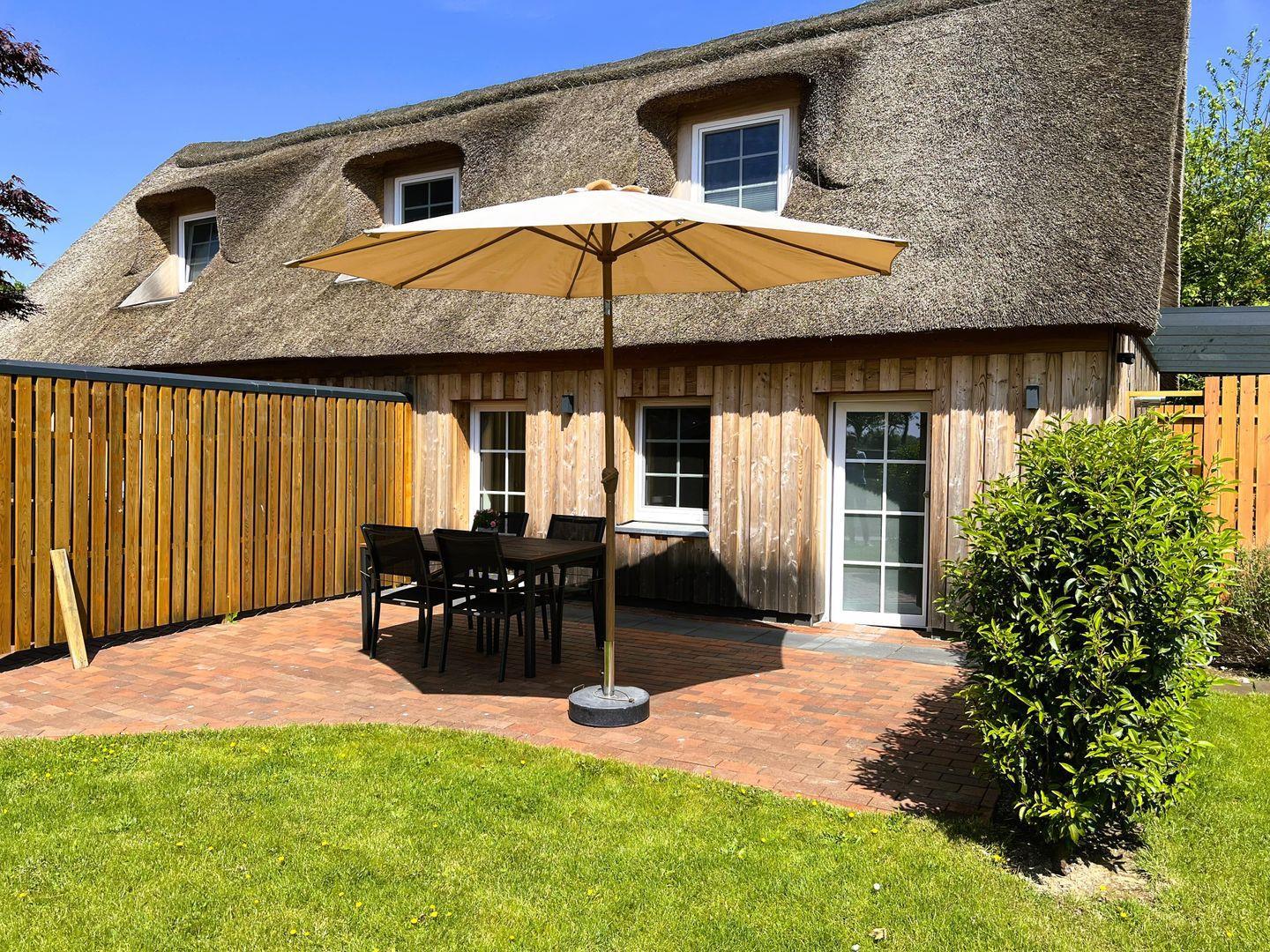 Im Außenbereich steht den Gästen eine Gartensauna (Fasssauna) zur Gemeinschaftsnutzung zur Verfügung, ergänzt durch eine Außendusche. Die Nutzung der Sauna kostet 8,00 € pro Stunde (Münzautomat). Der Gemeinschaftsgarten mit Liegewiese sowie die eigene Terrasse sind perfekt zum Entspannen geeignet; Gartenmöbel, Sonnenschirm und Windschutz sind vorhanden. Bitte beachten Sie, dass aufgrund des Reetdaches das Grillen nicht gestattet ist.