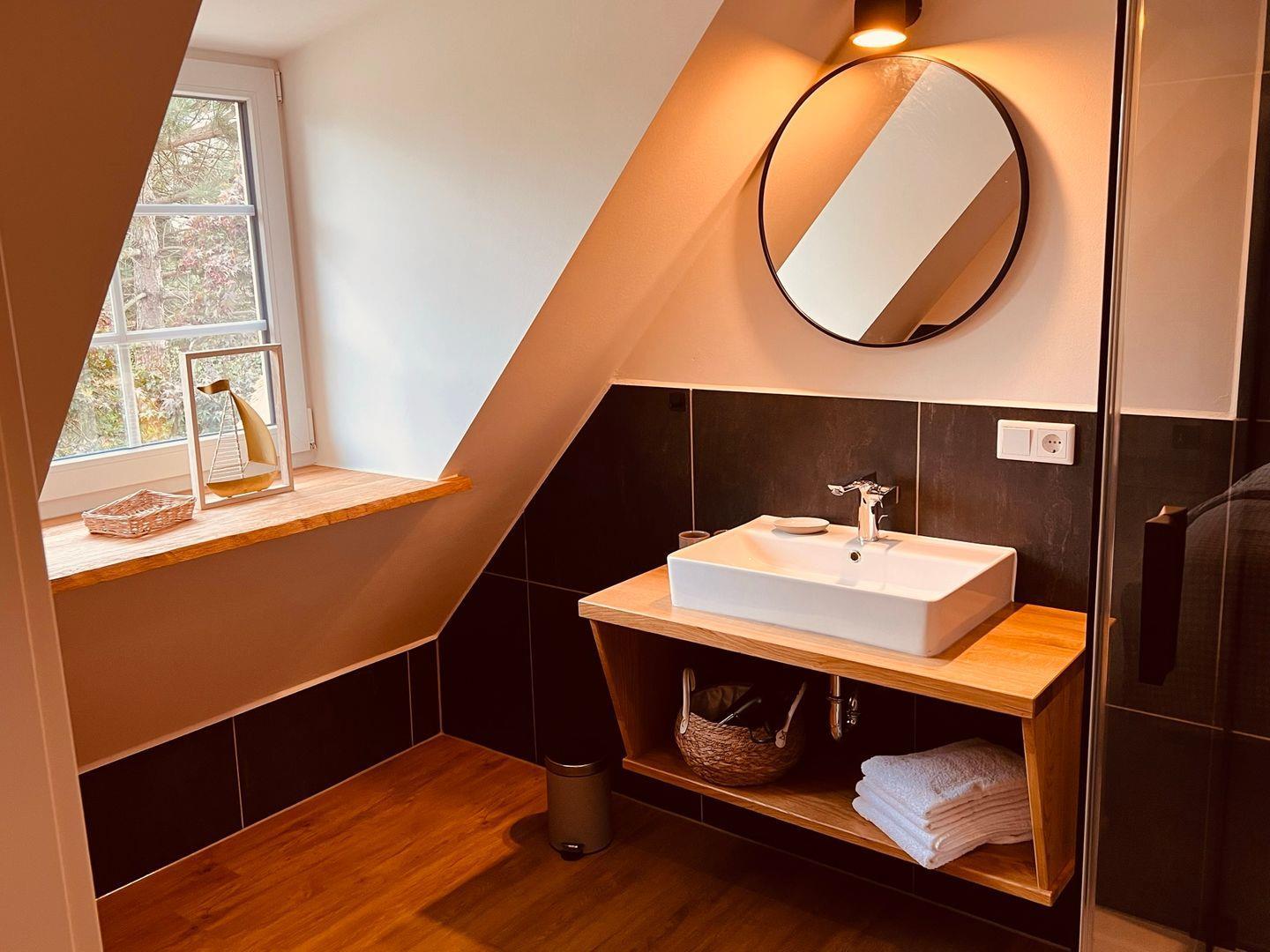 Das Schlafzimmer befindet sich auf einer offenen Galerie und bietet ein komfortables Boxspringbett (180x200 cm) mit offenem Fußende sowie einen Kleiderschrank. Verdunklungsmöglichkeiten sorgen für erholsame Nächte. Das Badezimmer ist funktional eingerichtet mit einer Dusche, WC, Haartrockner, Spiegel und Waschbecken sowie einem Fenster für frische Luft.