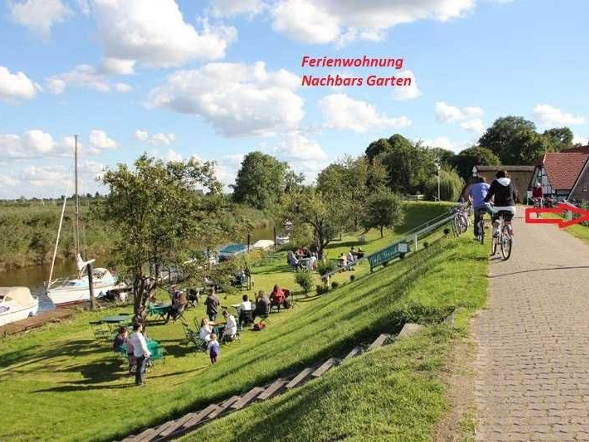 Ferienwohnung im Erdgeschoss eines Einfamilienhauses. Über eine Treppe am Deich erreichbar. Ein schöner Garten mit Strandkorb am Haus zum Sitzen oder Außendeich direkt am Wasser zum Relaxen.