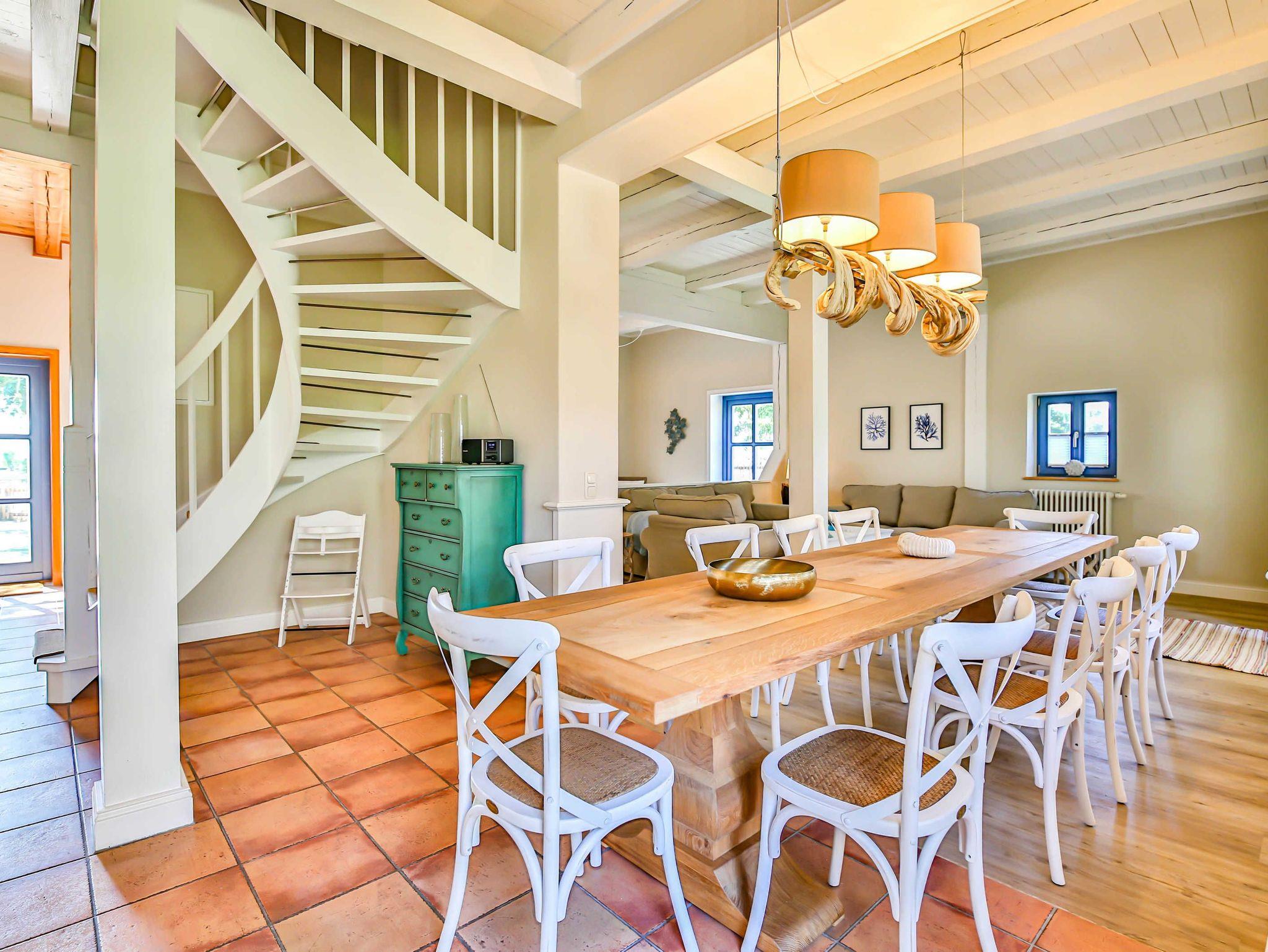 Das Ferienhaus Blaukehlchen im Sonnenhof ist ein 5-Sterne Ferienhaus mit viel Liebe zum Detail. Das Haus bietet 5 Schlafzimmer, wovon eines über einen barrierefreien Zugang mit separater Teeküche und Bad en Suite verfügt. Eine große voll ausgestattete Wohnküche, 3 Bäder und eine große Sonnenterrasse im anliegenden Garten. Das Haus befindet sich umgeben von Natur und direkt am Achterwasser. Zu empfehlen für Urlaub mit der Familie oder Freunden mit bis zu 10 Personen. Im Innenhof befindet sich eine großzügige Sauna.