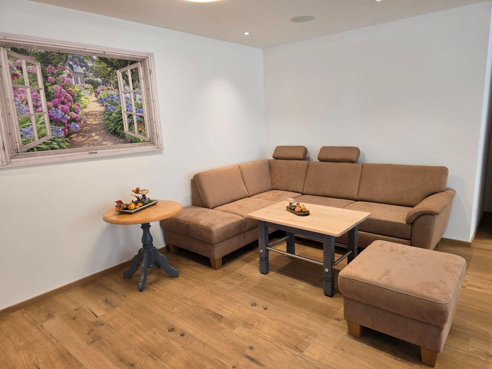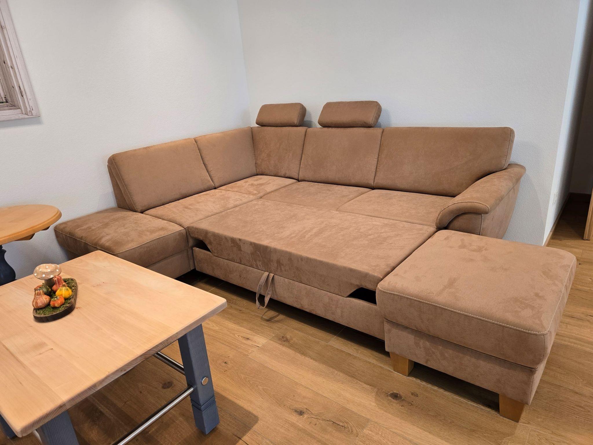 Die Couch im Wohnzimmer lässt sich als Schlafcouch ausziehen (Liegefläche 1,90m x 1,20m, mit Topper). Somit bietet die Wohnung Platz für 6 Personen. Ein Kinderbett kann kostenlos dazugestellt werden.
