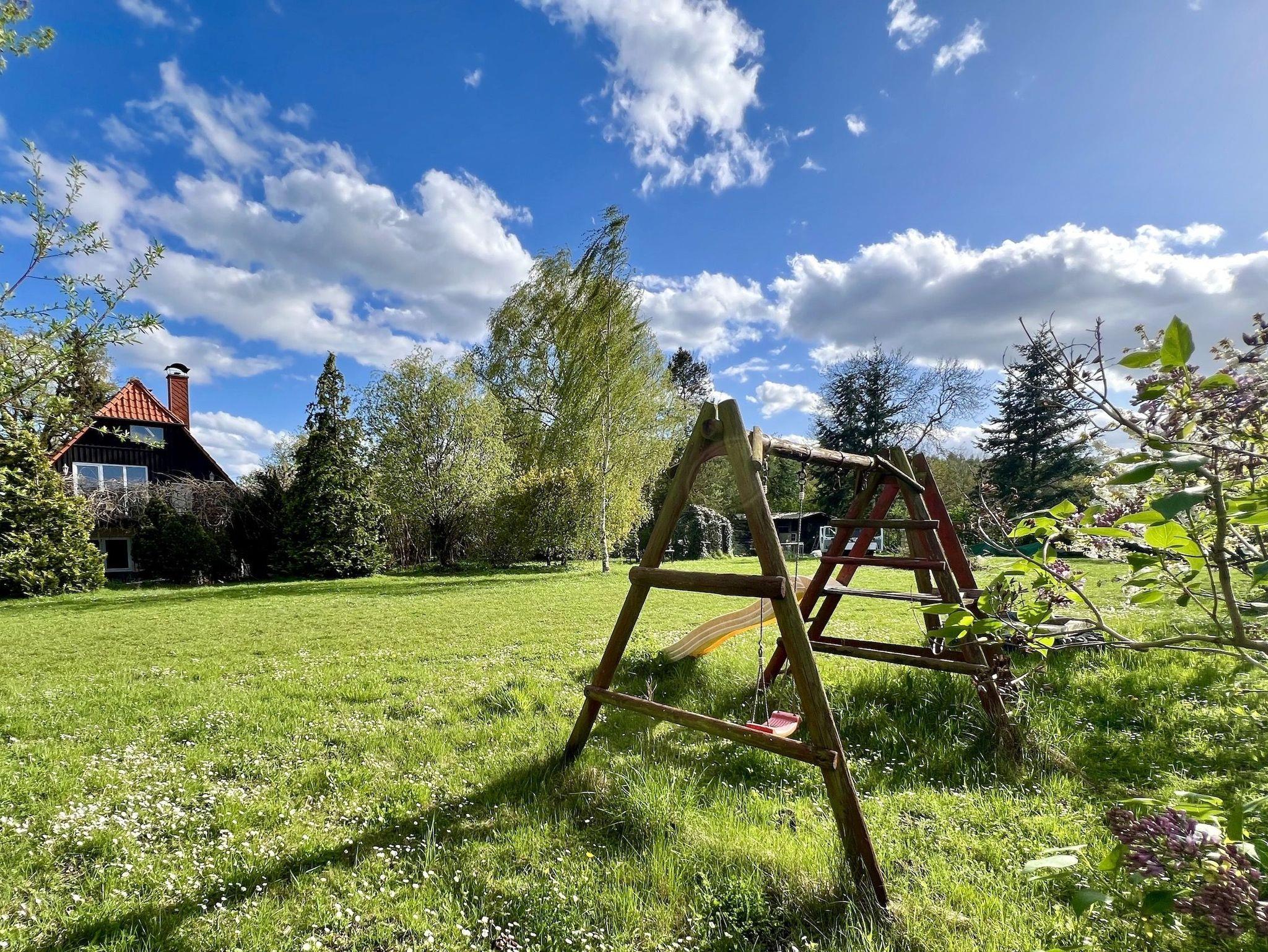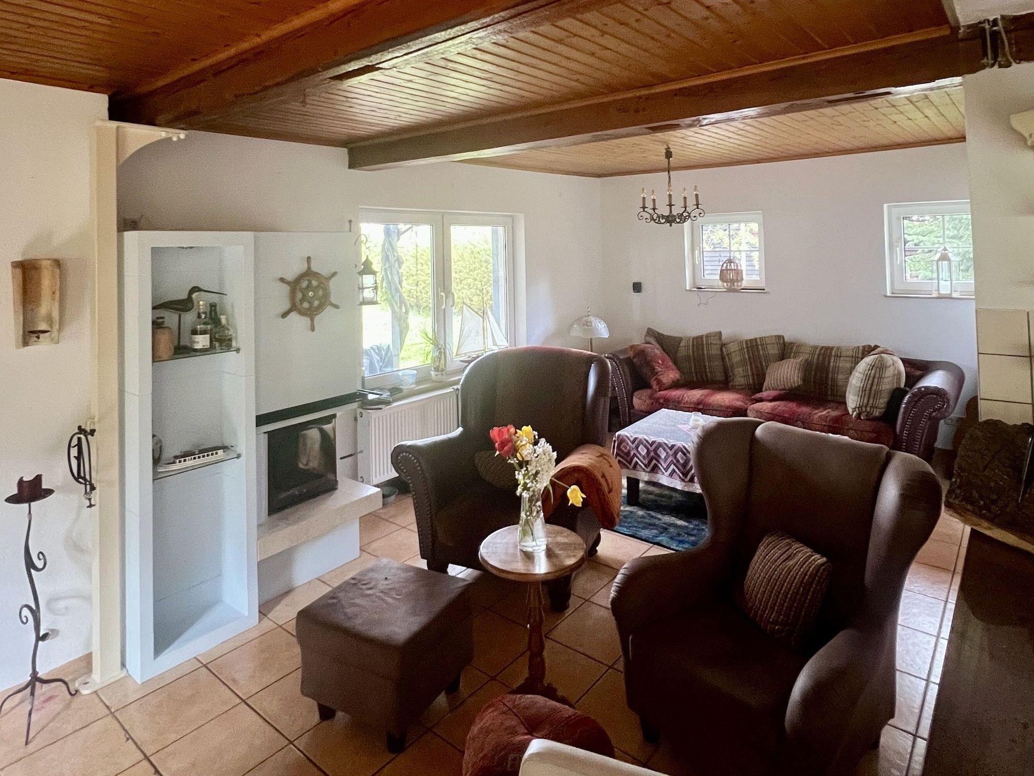 Im Erdgeschoss liegt die großzügige Wohnküche mit Esstisch, Kamin, gemütlicher Sitzecke und großem TV-Bildschirm. Von hieraus gelangen Sie auf die Außenterrasse mit Gartenmöbeln und Grill und in unseren weitläufigen, naturbelassenen Garten mit Rasenflächen, Obstbäumen und einem kleinen Spielplatz.