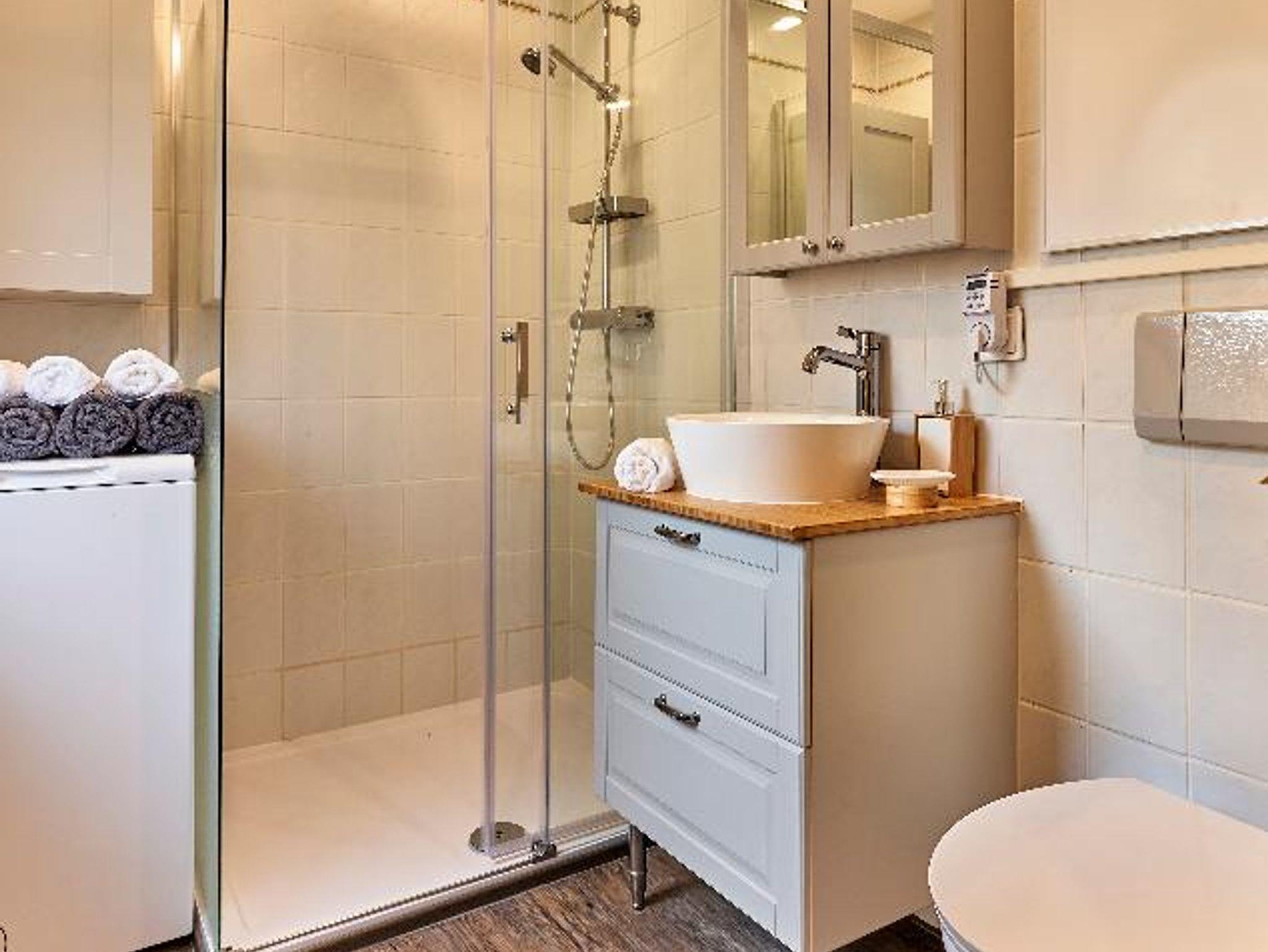 Kühlschrank mit kleinem Gefrierfach und E-Herd keine Wünsche offen. Im Bad