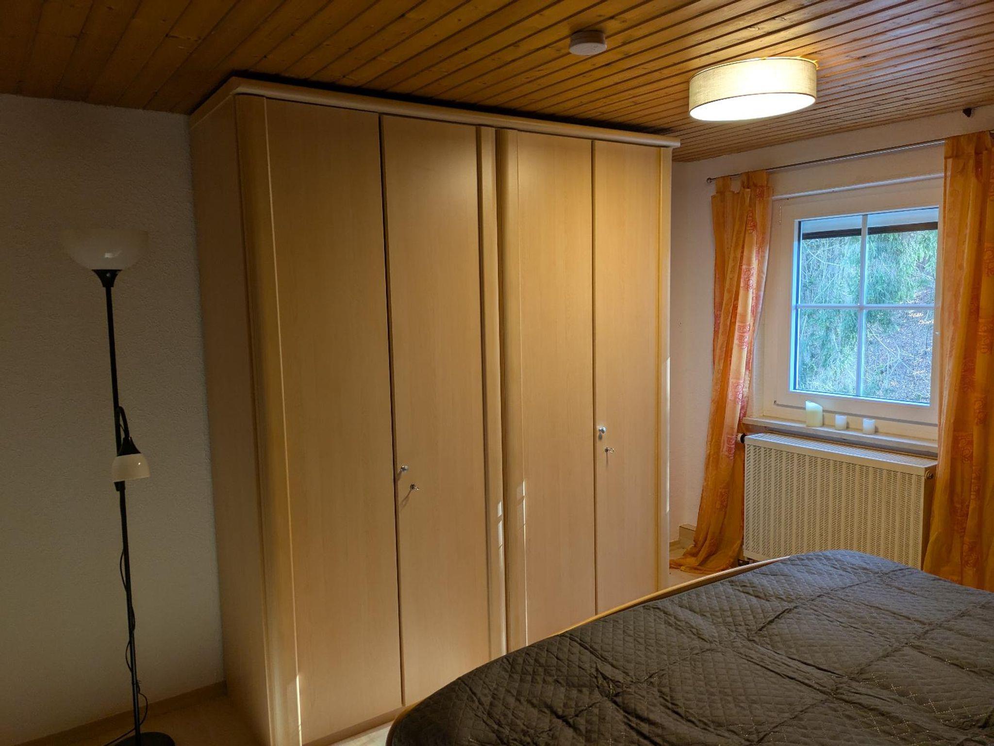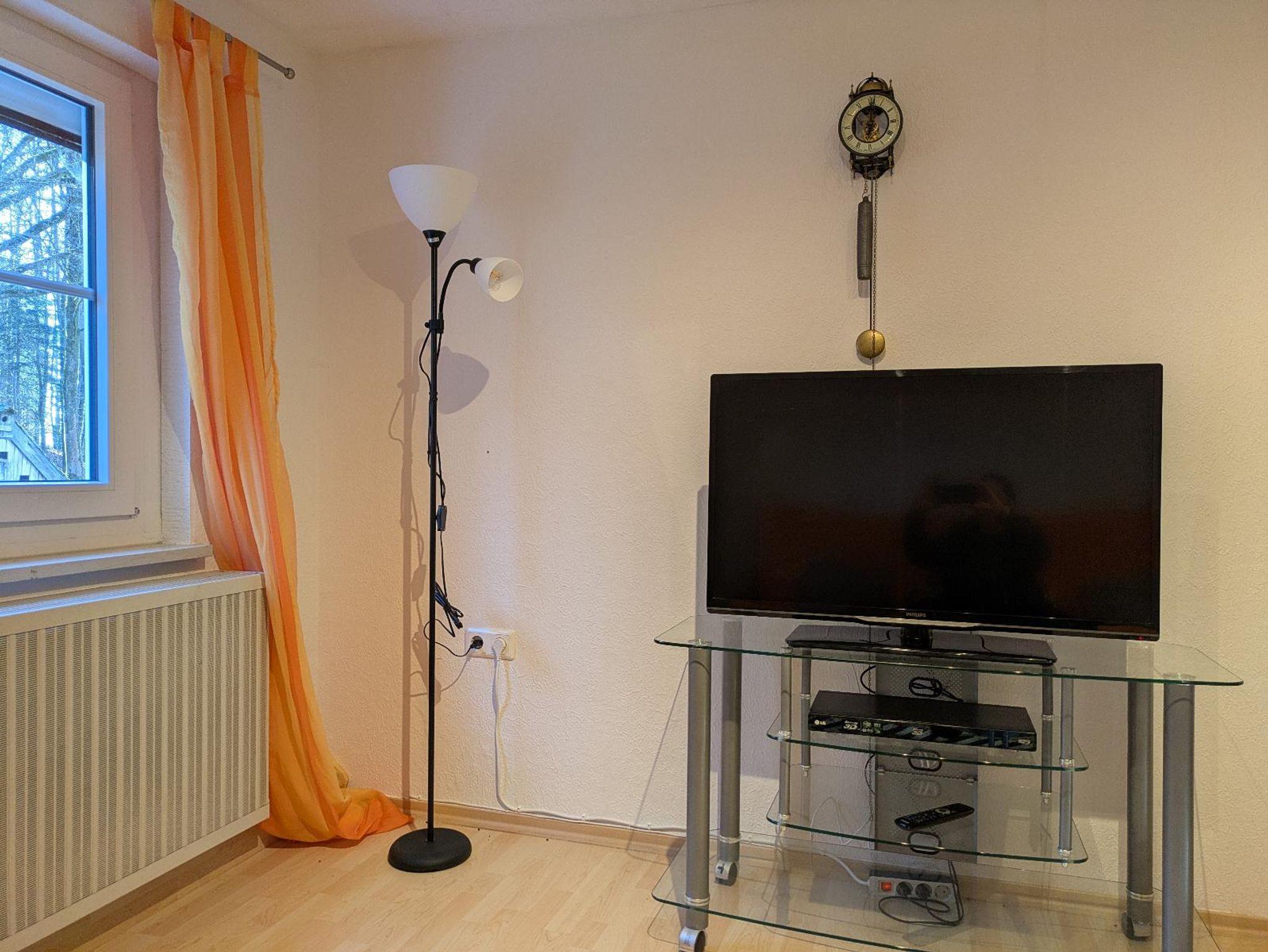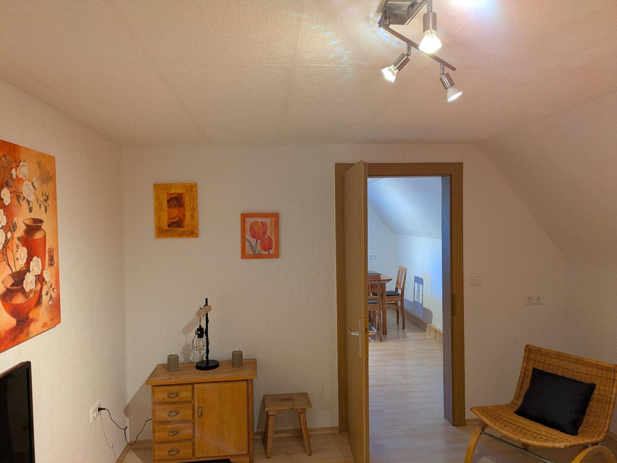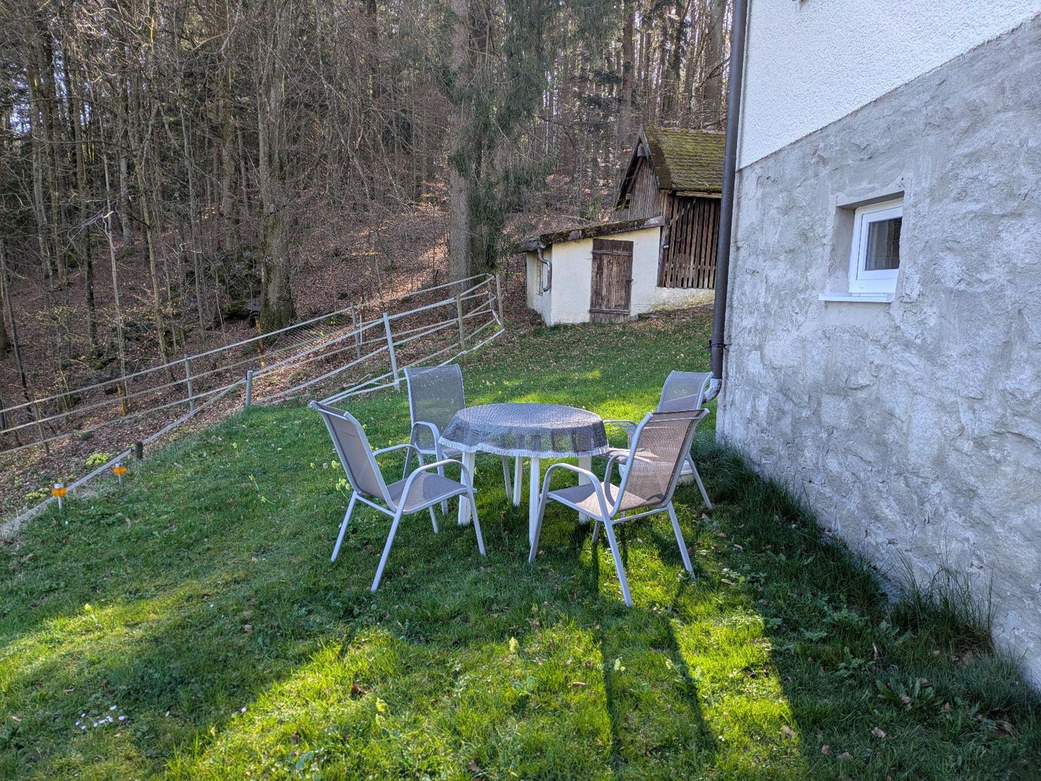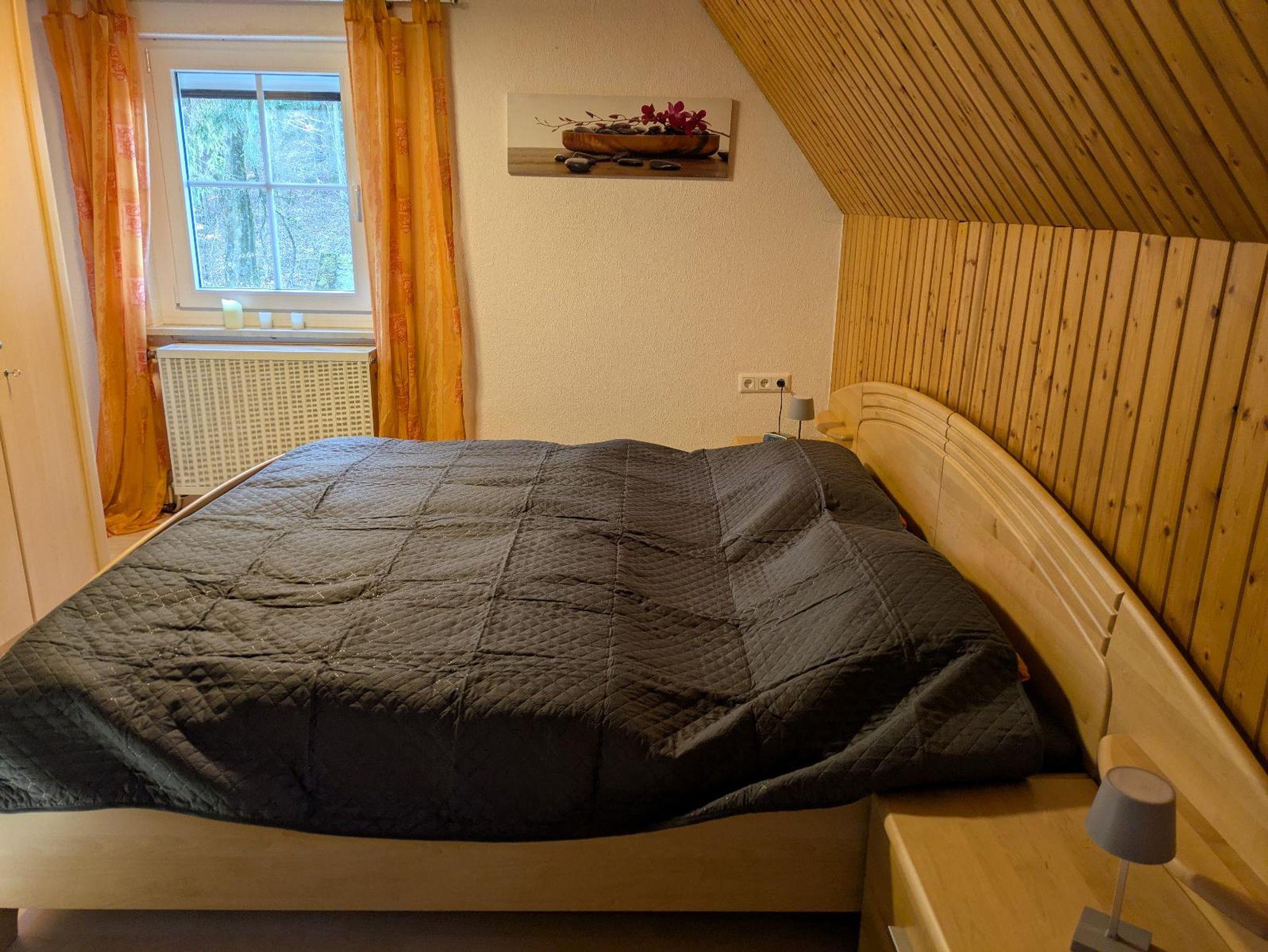 Die gemütliche Ferienwohnung befindet sich im ersten Stock und bietet auf 60 Quadratmetern Platz für bis zu 3 Personen und ein Kleinkind. Das gemütliche Wohnzimmer mit großem Schlafsofa und SAT-TV lädt zum Verweilen ein. Die komplett ausgestattete Küche mit Gechirrspüler, Kühlschrank, Herd, Backofen, Mikrowelle, Wasserkocher, Toaster und Kaffeepadmaschine lässt keine Wünsche offen. Das Schlafzimmer verfügt über ein großes Doppelbett, Kleiderschrank sowie einen Radiowecker. Ein Baby-Kleinkindbett und ein Hochstuhl sind zusätzlich vorhanden. Das Tageslichtbad verfügt über Dusche, Waschbecken, WC und Föhn. Sämtliche Wäsche inkl.( Bettwäsche, Handtücher, Geschirrtücher). Vorallem im Sommer können Sie sich im Garten oder auf der Terasse entspannen. Sonnenliegen stehen zur Verfügung. Ihr Nachbar ist nur der Wald. Das WLAN und den Parkplatz vor dem Haus können Sie kostenfrei nutzen. Nichtraucherwohnung.