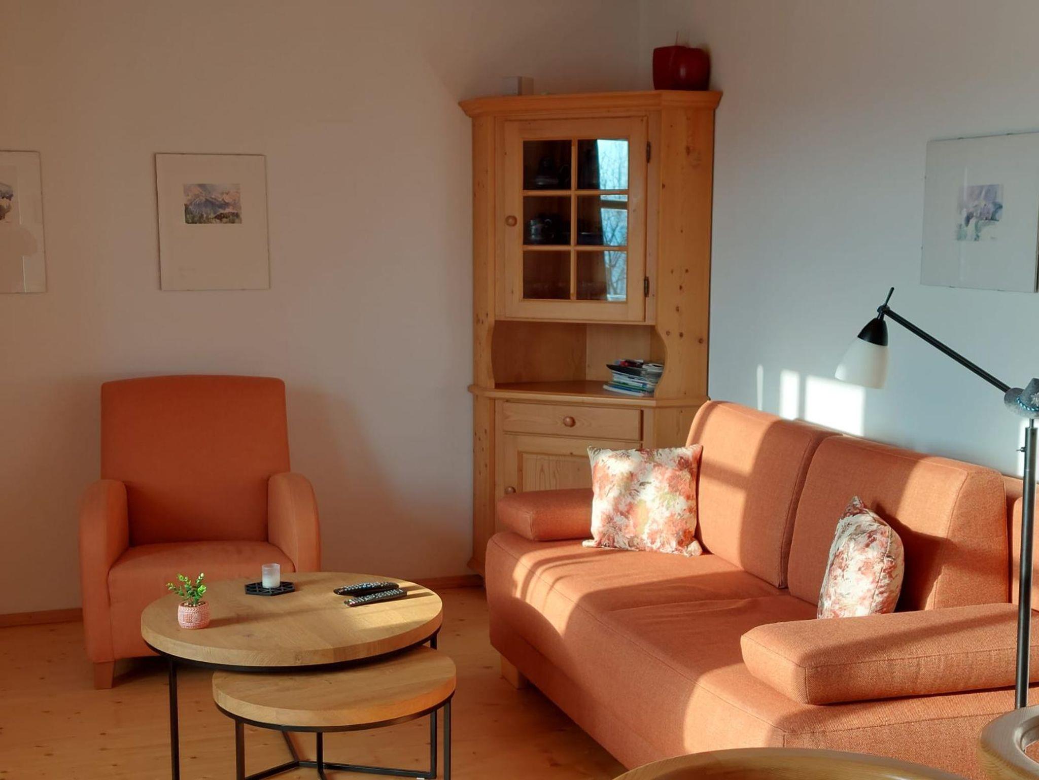 Durch einen Flur mit Garderobe und Schuhablage gelangt man in das Wohn-/Esszimmer, das mit Massivholzmöbeln aus einer Schreinerei der näheren Umgebung, Landhausdielen und Kaminofen eingerichtet ist. Auf dem (Schlaf)sofa oder zwei Ohrensesseln lässt sich beim Fernsehen (Satellitenempfang), Radio-, CDhören (Es gibt einige MusikCDs und Hörbücher.) oder beim Abspielen der eigenen Unterhaltung vom I-pod gut entspannen. Von diesem Raum aus gelangt man in die beiden Schlafzimmer sowie Küche und Bad und auf die Terrasse, die sich über die ganze Hausseite erstreckt.