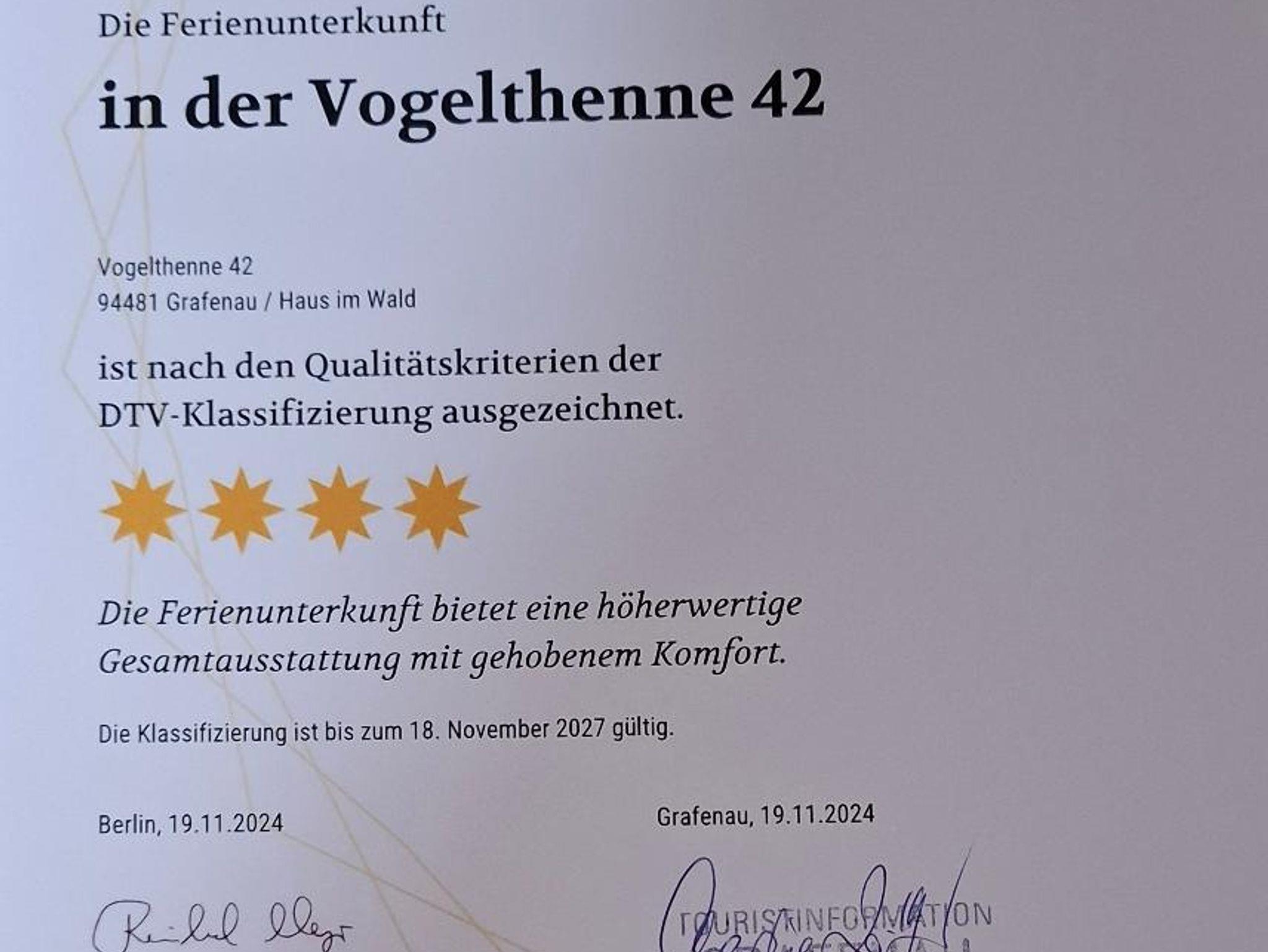 Die Liegeflächen im Garten sind zusammen ca. 250 m² groß, neben zwei lange blühenden Hängen. Vom Grundstück aus hat man einen weiten Blick ins Ilztal. Eine überdachte Terrasse und reichlich Gartenmöbel für zwei bis drei verschiedene Sitzplätze sowie ein Sonnenschirm bieten Möglichkeiten zum Entspannen. Das Ferienhaus wurde Ende 2024 wieder mit 4 Sternen bewertet.