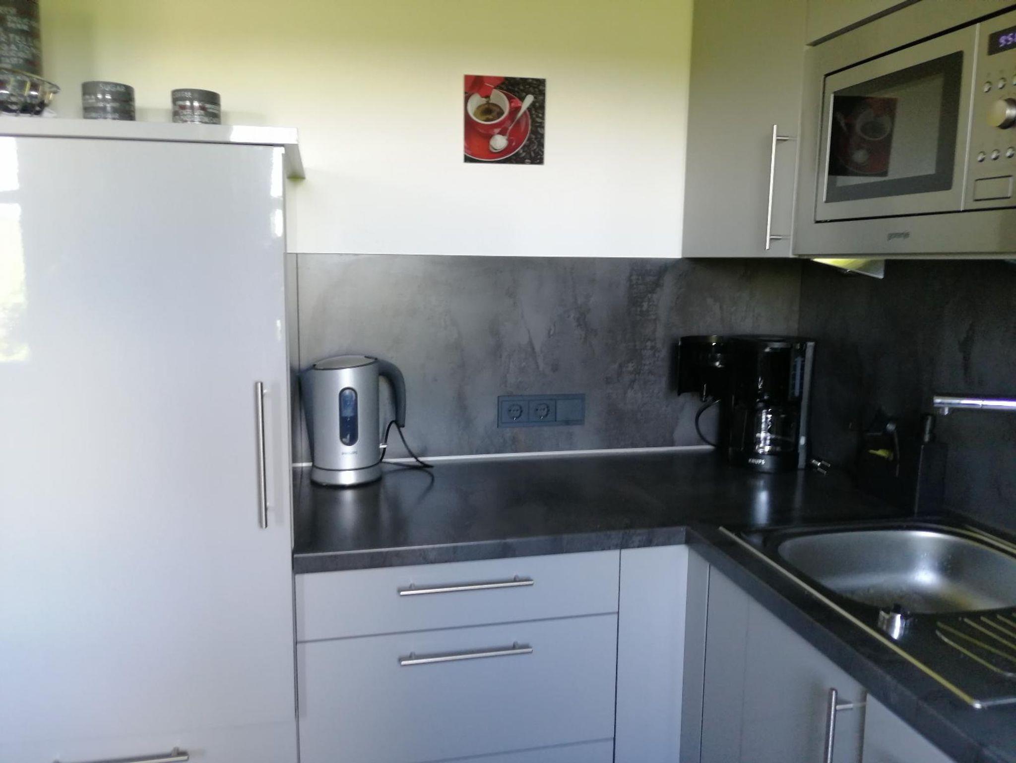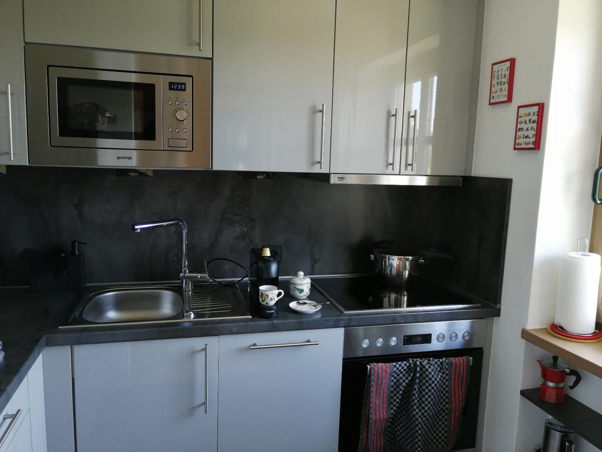 Die Hochglanzküche von 2016 ist volleingerichtet. Zum Kochen steht Ihnen ein Herd mit Ceranfeld, Backofen, Dunstabzugshaube, Mikrowelle sowie Geschirrspülmaschine zur Verfügung. Der Kühlschrank ist mit einem vier Sterne Gefrierfach ausgestattet. Sie können wählen zwischen einer Maschine für Filterkaffee, einem italienischen Espressokocher, einer Kapsel- oder Teemaschine. Daneben finden Sie einen Wasser-, Eierkocher, Toaster, Schnellkochtopf sowie überdurchschnittlich viel Geschirr , Besteck, Gläser. Eine Grundausstattung an Zucker, Mehl, Salz, Gewürzen, Essig, Öl, Geschirrspültabs, Geschirrtüchern ist vorrätig.