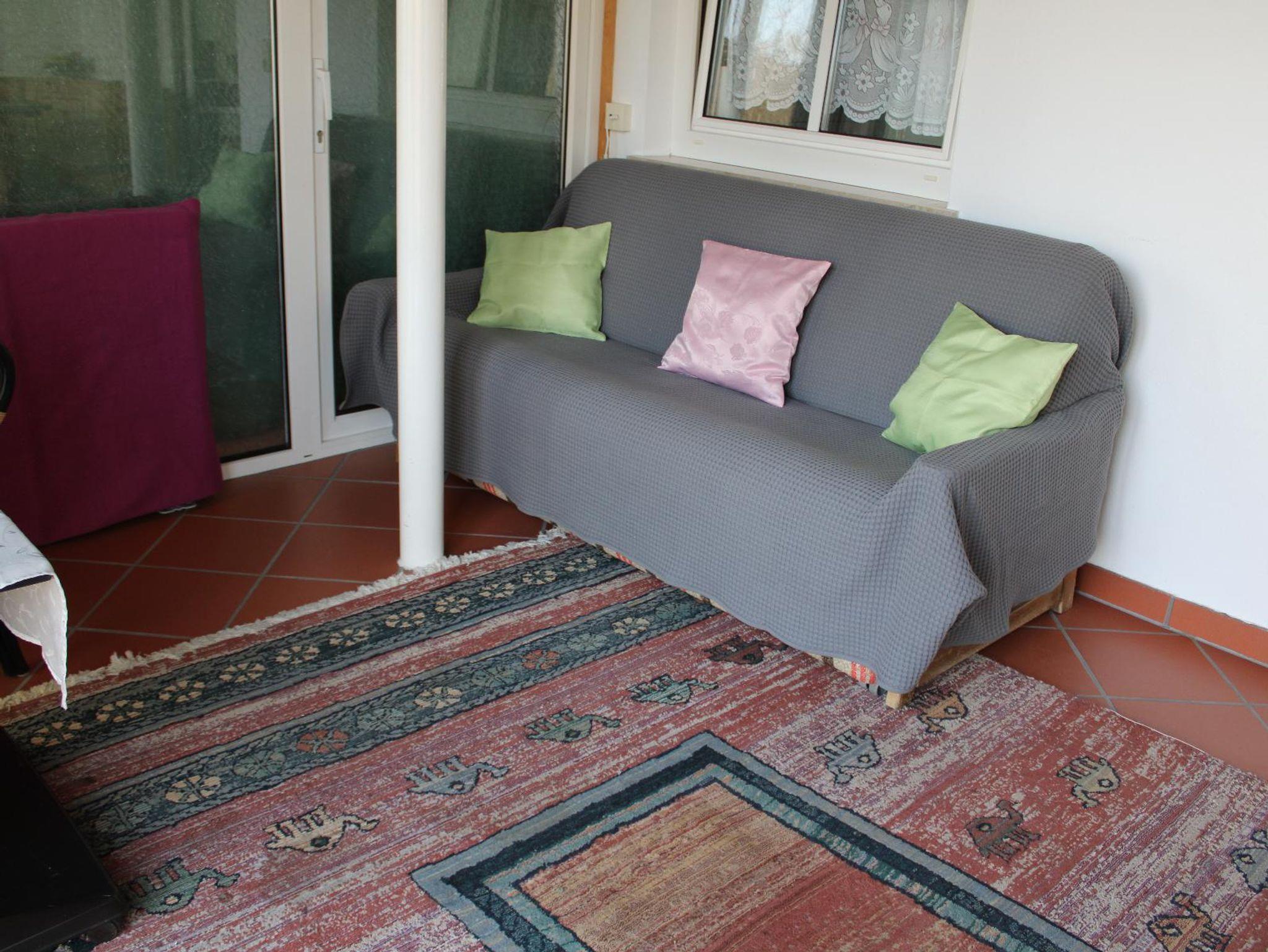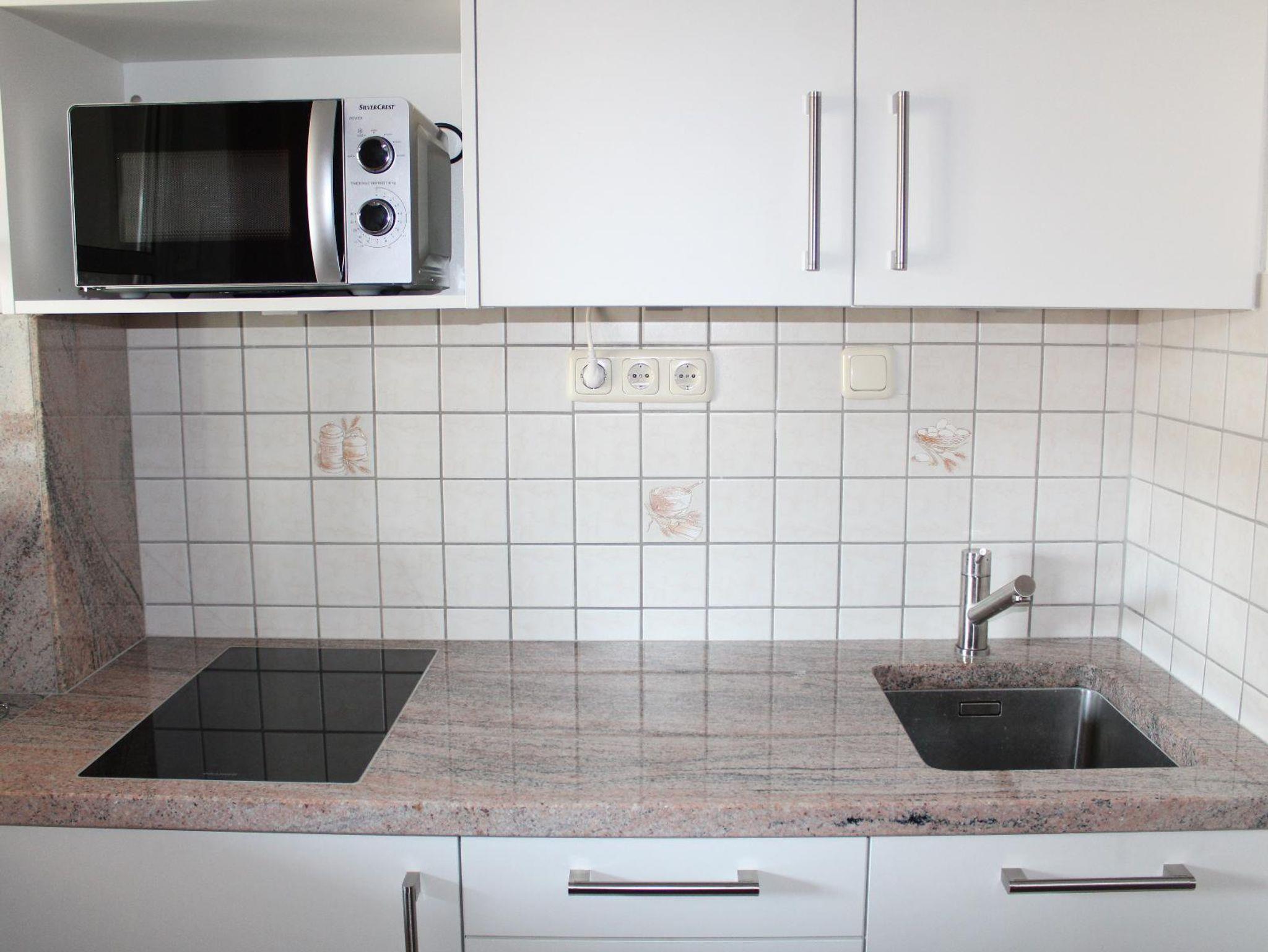 Die Wohnung befindet sich im 2. Untergeschoss, hat einen kleinen Gang mit Zugang zum Schlafzimmer mit Doppelbett, zum Bad mit Dusche, WC und Bidet und zum Wohn-/Schlafraum mit Doppelbett. Von diesem gelangt man sowohl zur Kochnische mit Kühlschrank, 2 Herdplatten, kleinem Backofen, Toaster, Kaffeemaschine, Wasserkocher, (Koch-) Geschirr u.ä., als auch zum Wintergarten mit Eckbank, Couch und TV. Kochnische und Esstisch sind mit exklusiver ist Granitplatte ausgestattet.
