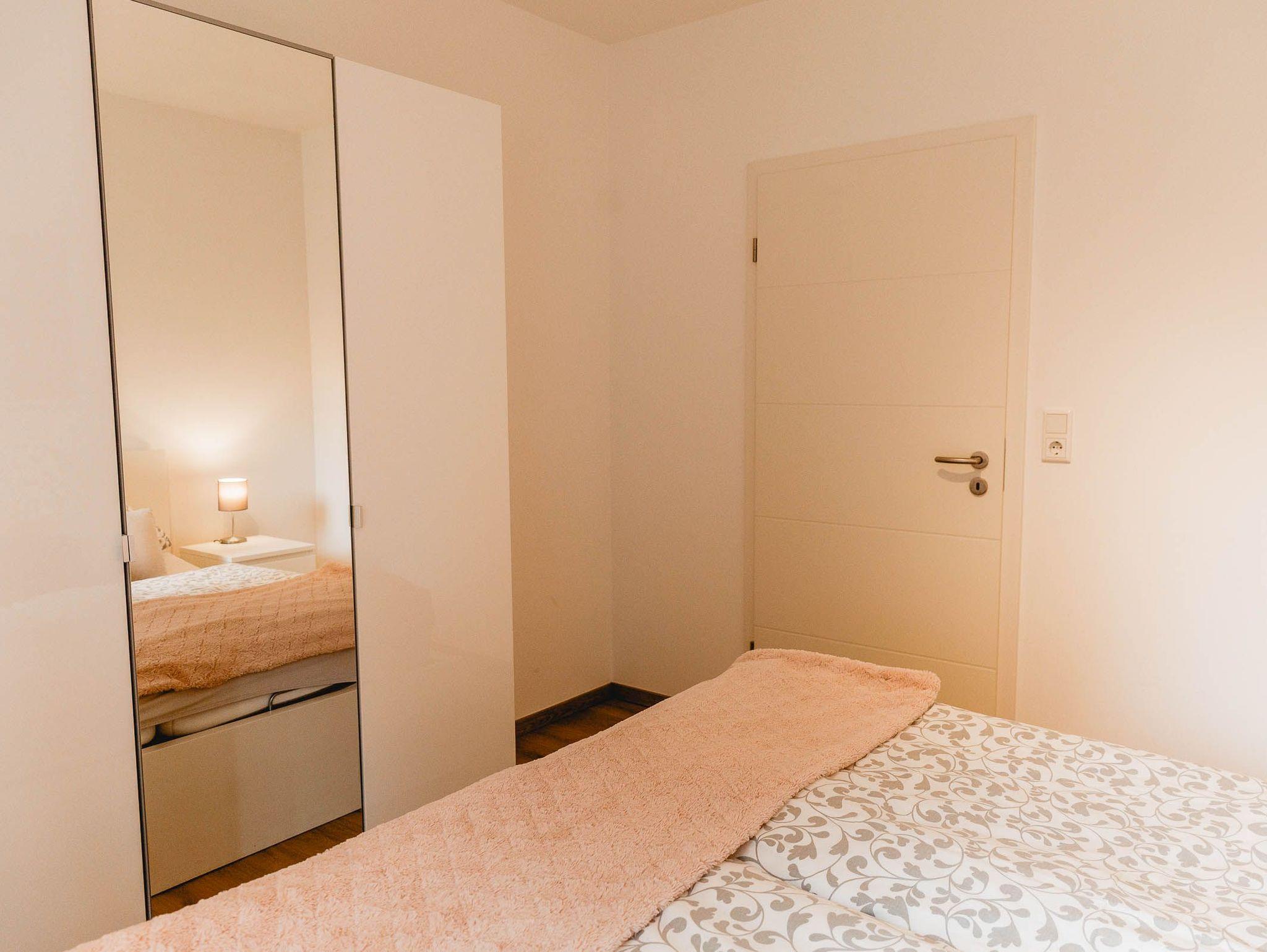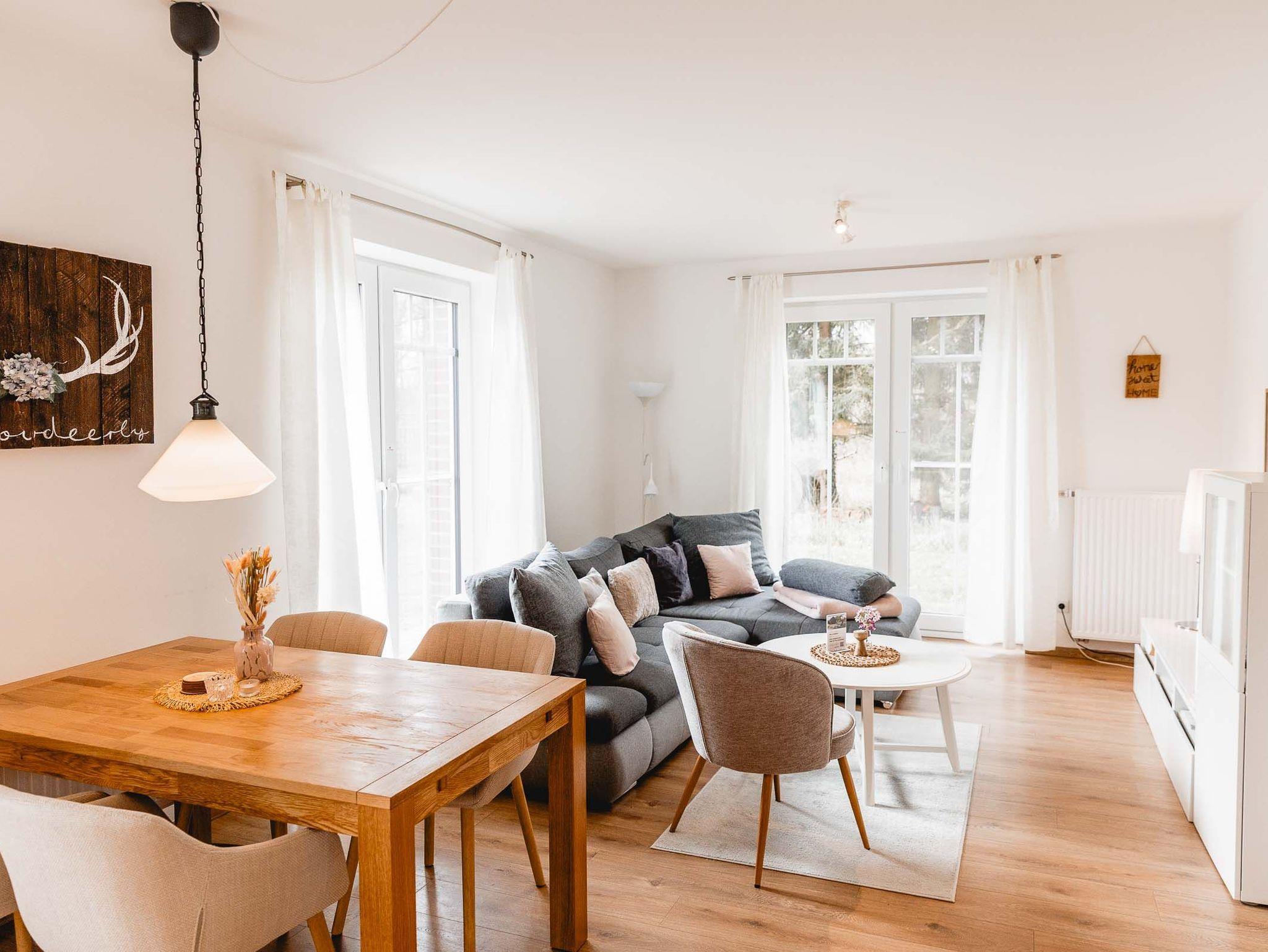 Die Wohnung Landliebe befindet sich im EG unseres Neubaus und bietet auf 60 qm Platz für bis zu vier Personen. Aufgeteilt ist sie in zwei Schlafzimmer (1 SZ mit Doppelbett, 1 SZ mit einem Einzelbett, das sich zu einem vollwertigen Doppelbett ausziehen lässt), einem Wohn/Essbereich mit komplett ausgestatteter Küchenzeile, Dusche/WC, Abstellraum und Terrasse. Diese Wohnung ist barrierefrei.